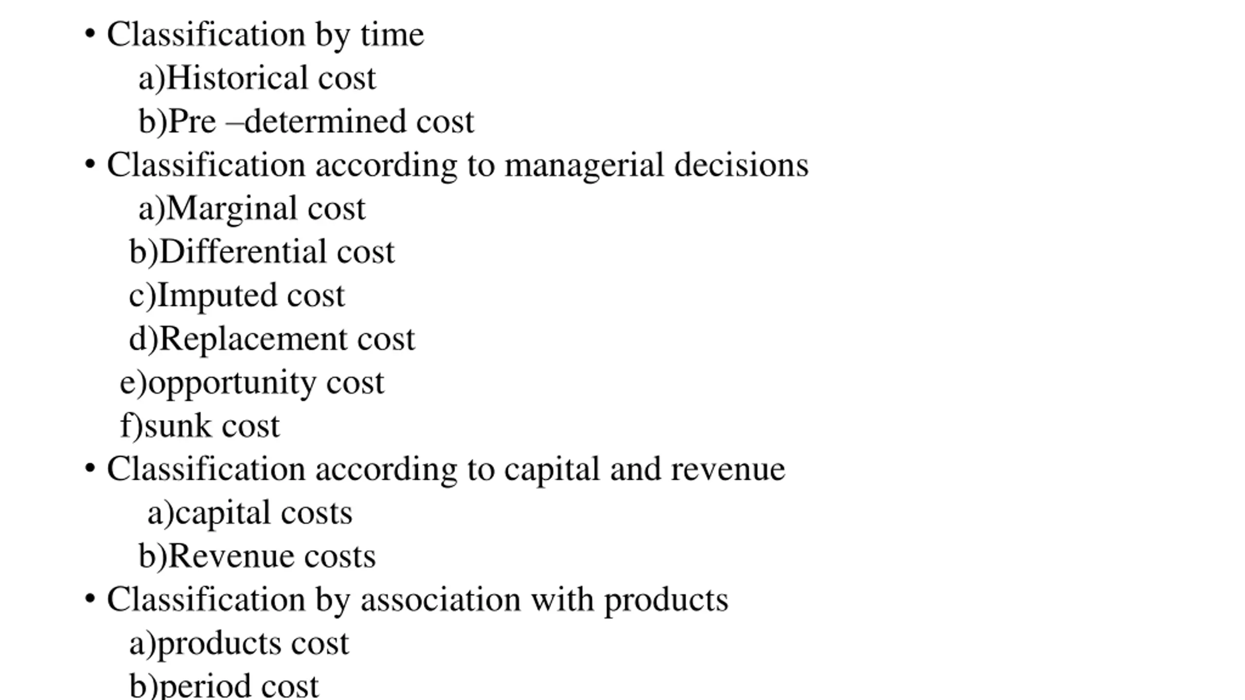 Classification by time a)Historical cost b)Pre determined cost Classification according to managerial decisions a)Marginal cost b)Differential cost c)Imputed cost d)Replacement cost e)opportunity cost f)sunk cost Classification according to capital and revenue a)capital costs b)Revenue costs Classification by association with products a)products cost b)period cost