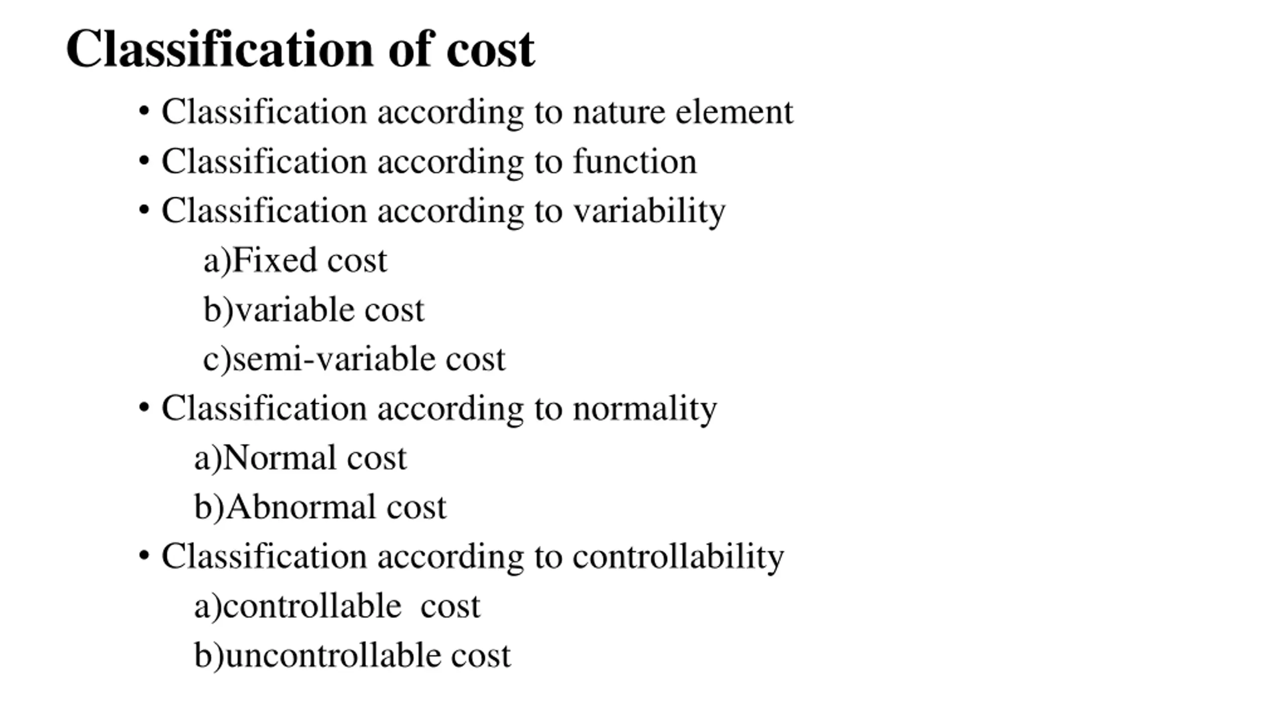Classification of cost Classification according to nature element Classification according to function Classification according to variability a)Fixed cost b)variable cost c)semi-variable cost Classification according to normality a)Normal cost b)Abnormal cost Classification according to controllability a)controllable cost b)uncontrollable cost