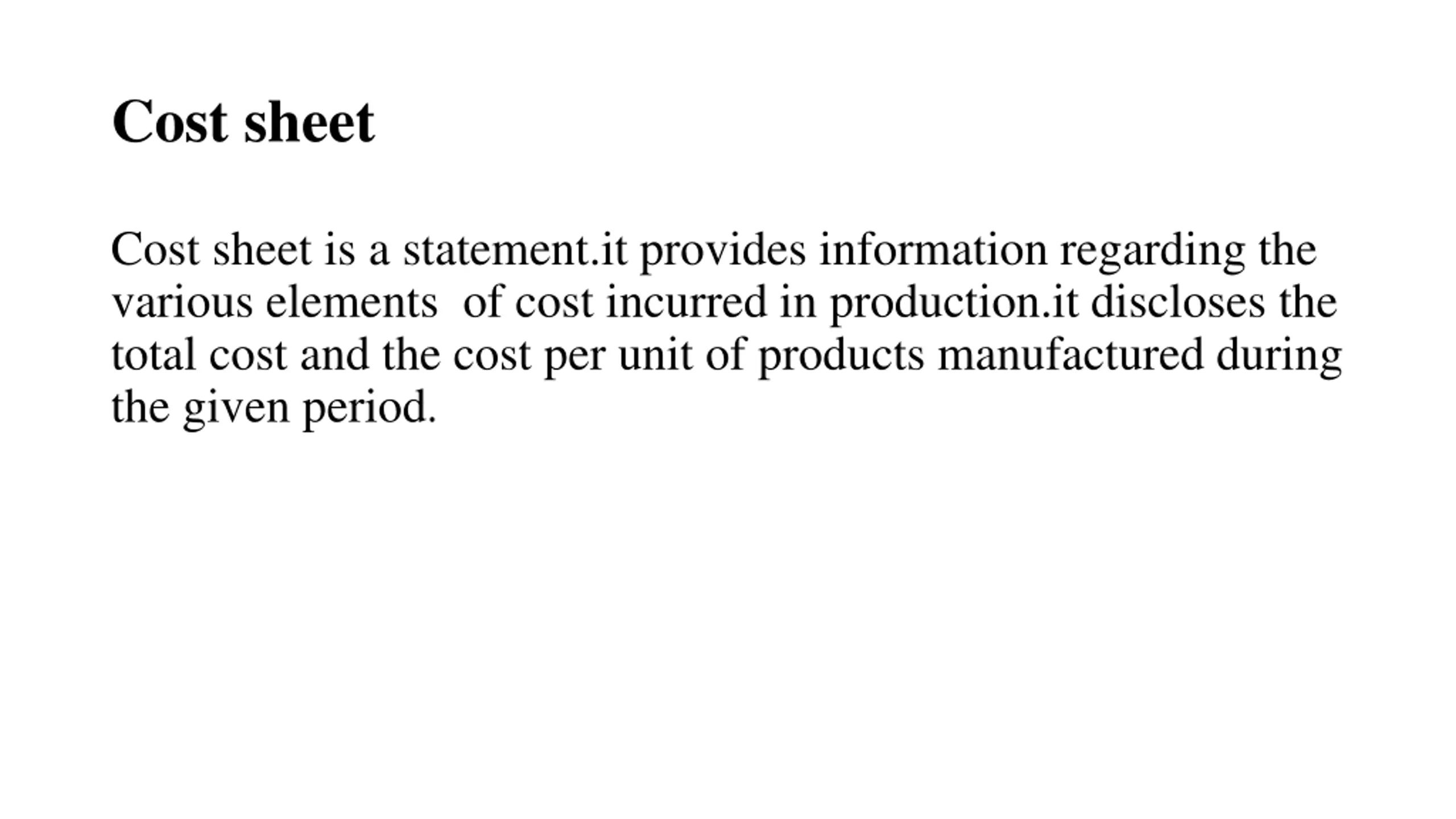 Cost sheet Cost sheet is a statement.it provides information regarding the various elements of cost incurred in production.it discloses the total cost and the cost per unit of products manufactured during the given period.