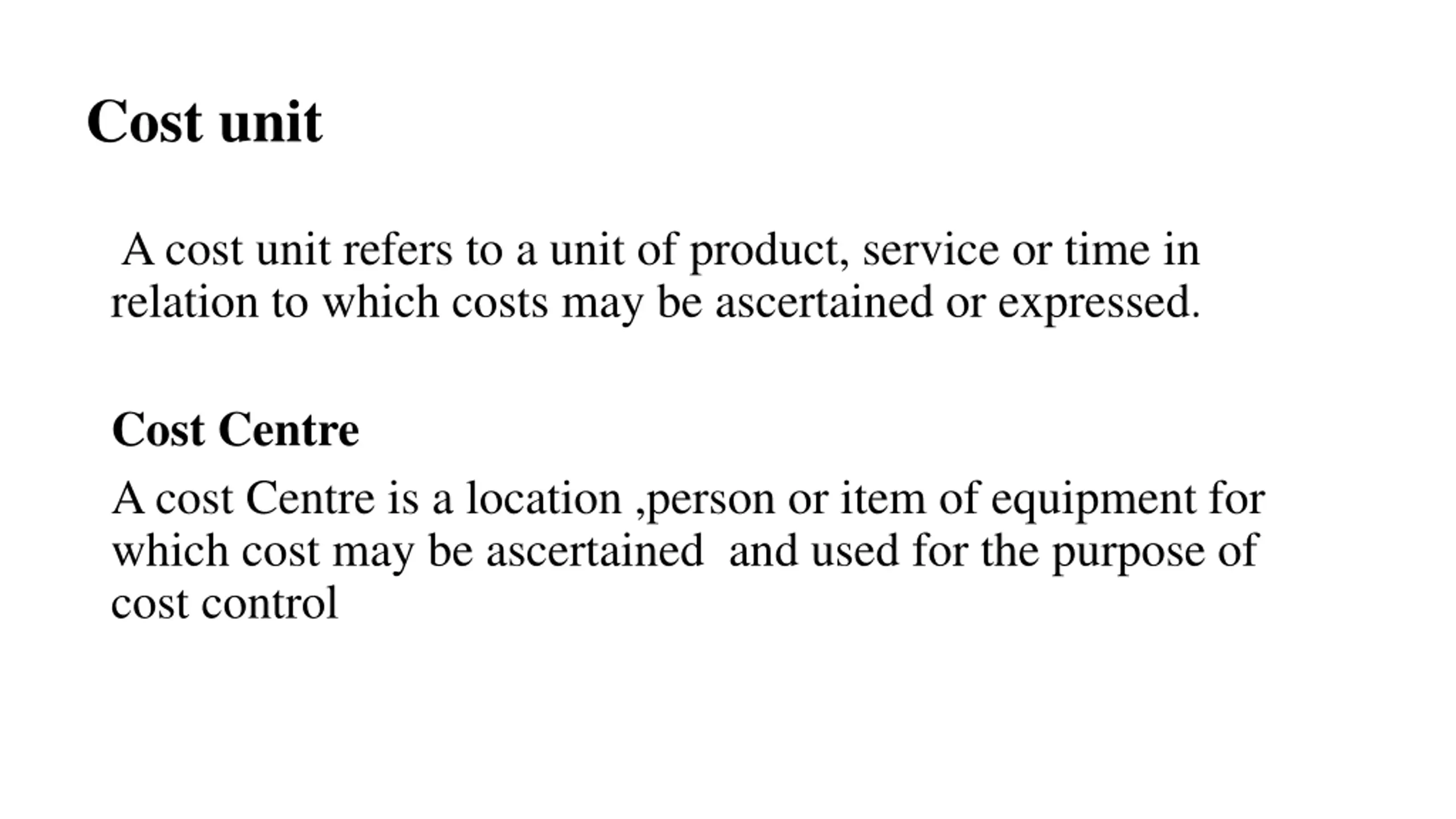 Cost unit A cost unit refers to a unit of product, service or time in relation to which costs may be ascertained or expressed. Cost Centre A cost Centre is a location ,person or item of equipment for which cost may be ascertained and used for the purpose of cost control