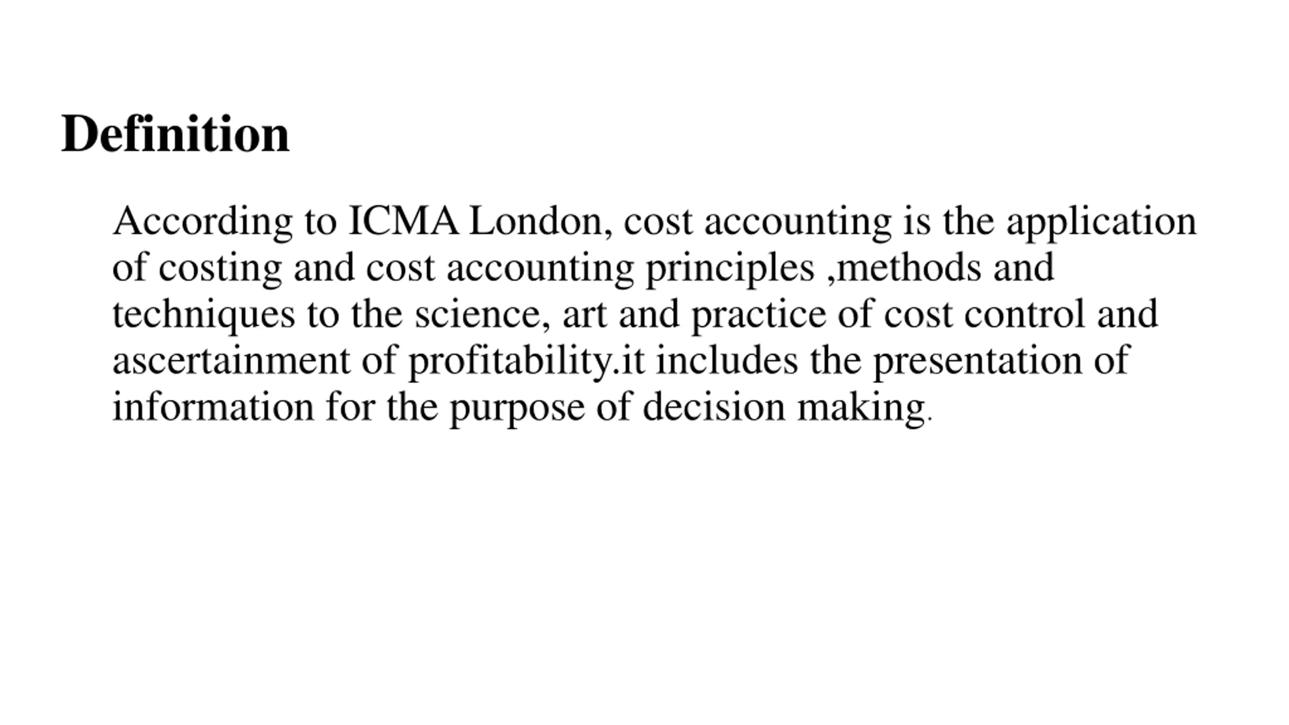 Definition According to ICMA London, cost accounting is the application of costing and cost accounting principles ,methods and techniques to the science, art and practice of cost control and ascertainment of profitability.it includes the presentation of information for the purpose of decision making.