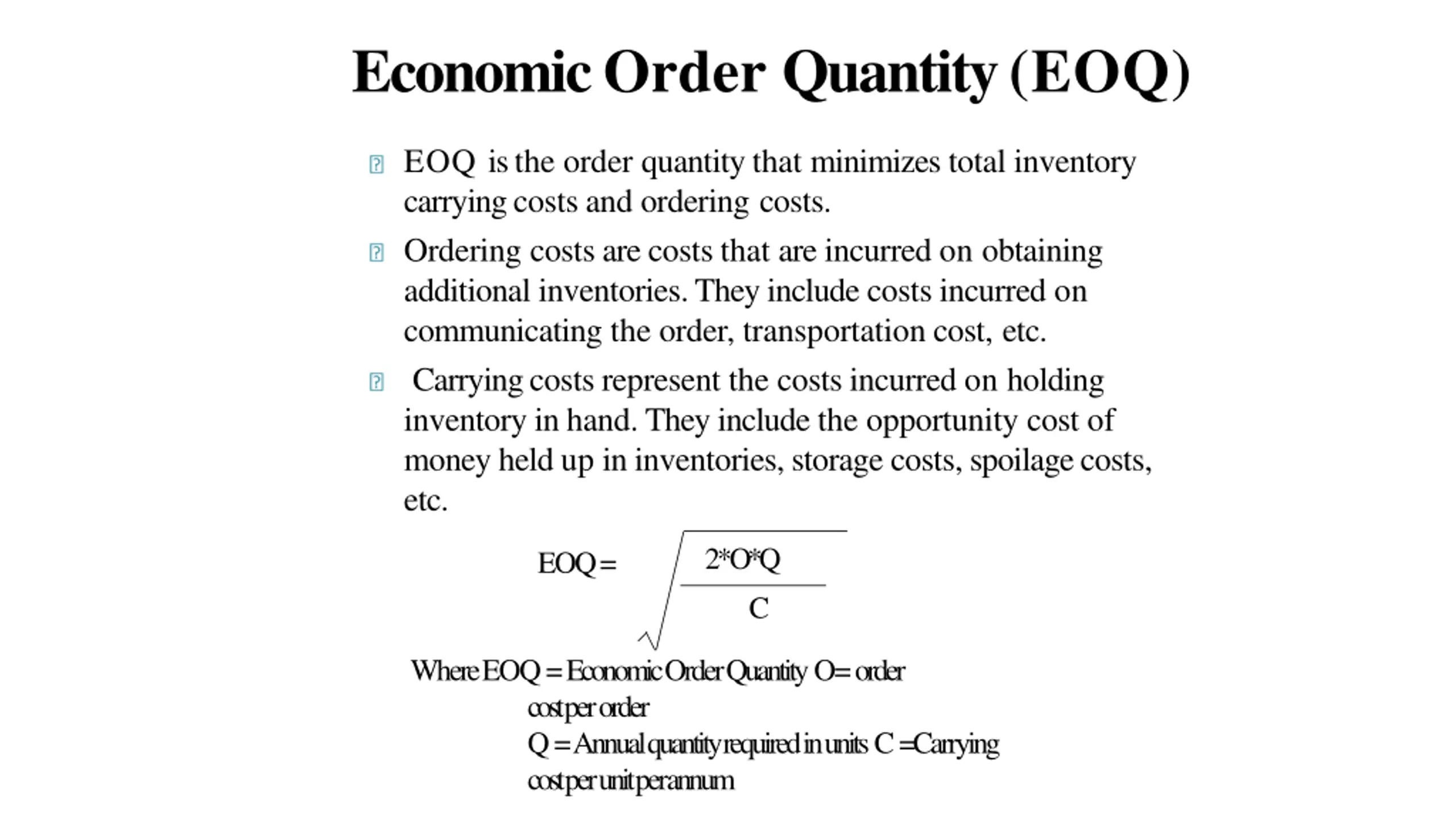 Economic Order Quantity(EOQ) EOQ is the order quantity that minimizes total inventory carrying costs and ordering costs. Ordering costs are costs that are incurred on obtaining additional inventories. They include costs incurred on communicating the order, transportation cost, etc. Carrying costs represent the costs incurred on holding inventory in hand. They include the opportunity cost of money held up in inventories, storage costs, spoilage costs, etc. 2*O*Q EOQ= C Where EOQ = Economic Order Quantity O= order cost perorder Q = Annual quantity required in units C =Carrying cost per unit perannum