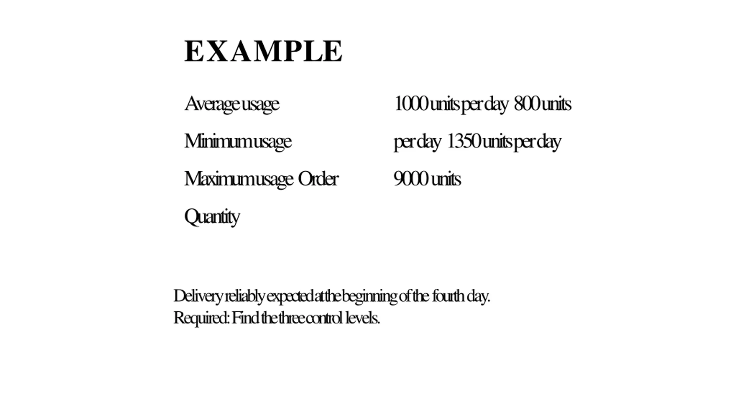 EXAMPLE Average usage 1000 units per day 800 units Minimum usage per day 1350 units per day Maximum usage Order 9000units Quantity Delivery reliably expected at the beginning of the fourthday. Required: Find the three controllevels.