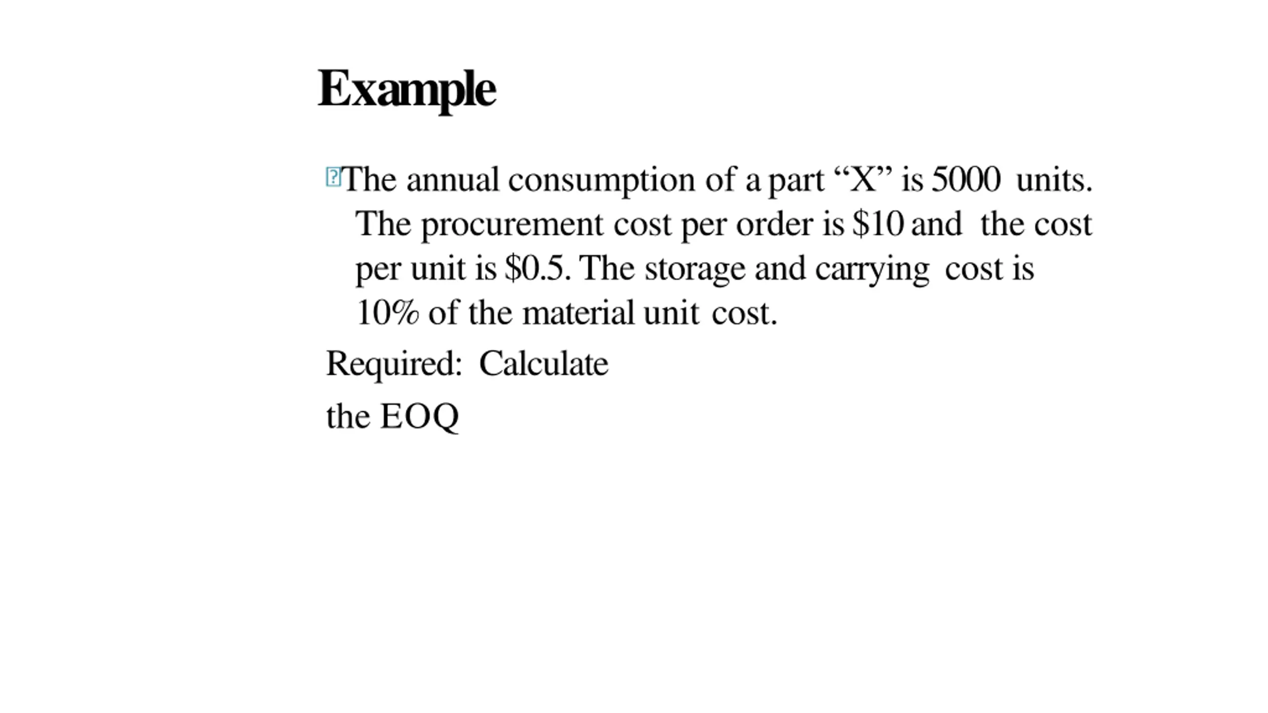 Example The annual consumption of a part X is 5000 units. The procurement cost per order is $10 and the cost per unit is $0.5. The storage and carrying cost is 10% of the material unit cost. Required: Calculate the EOQ