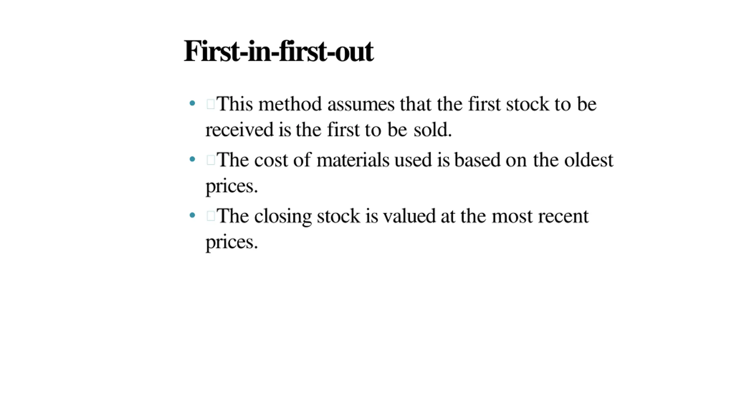 First-in-first-out This method assumes that the first stock to be received is the first to be sold. The cost of materials used is based on the oldest prices. The closing stock is valued at the most recent prices.
