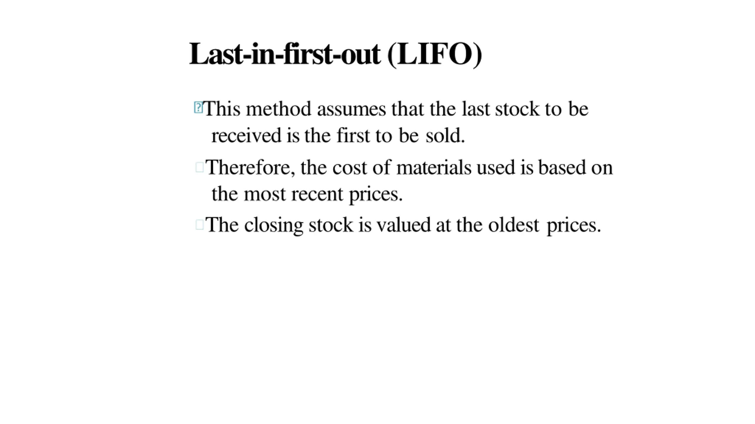 Last-in-first-out(LIFO) This method assumes that the last stock to be received is the first to be sold. Therefore, the cost of materials used is based on the most recent prices. The closing stock is valued at the oldest prices.