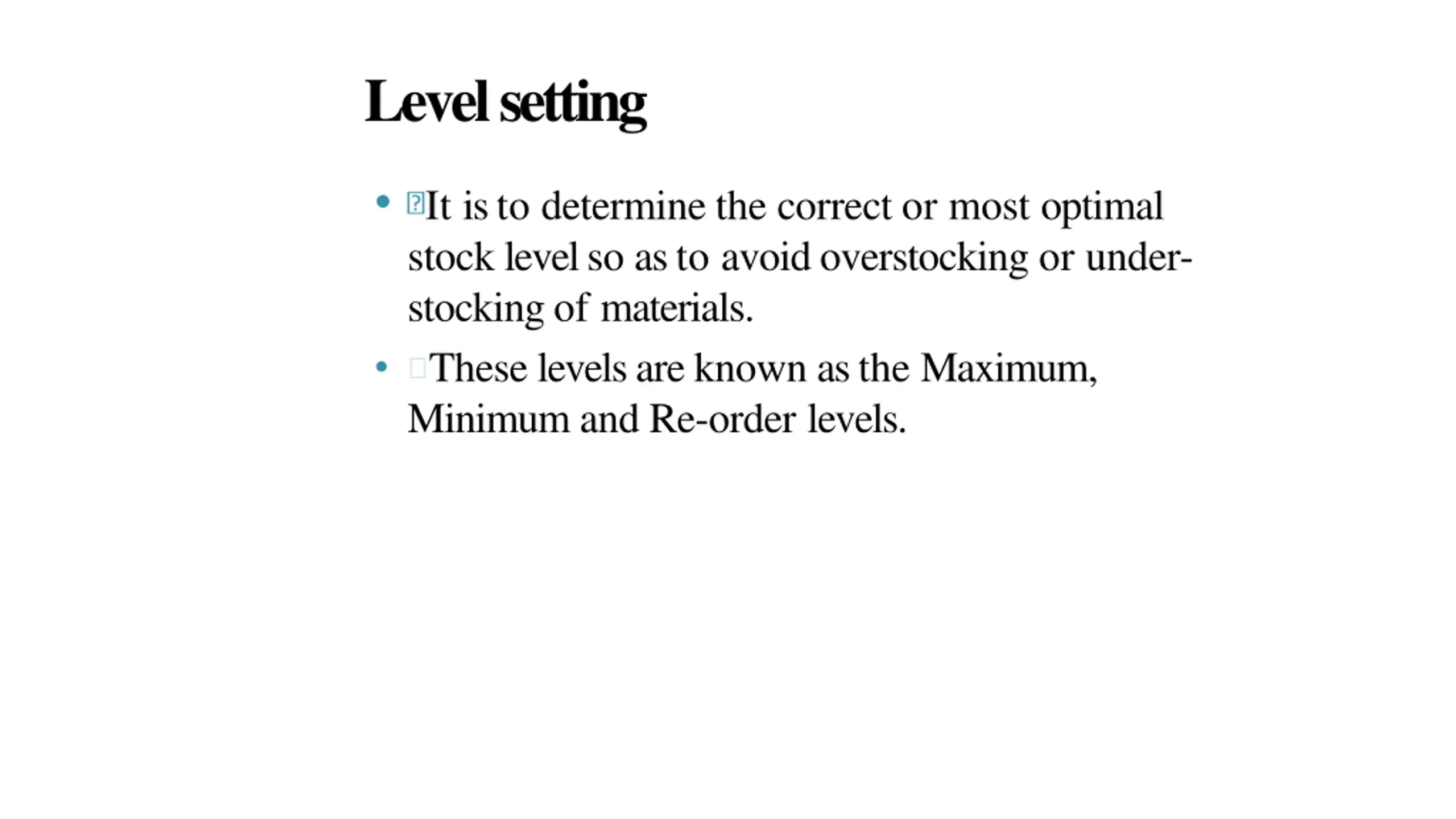Levelsetting It is to determine the correct or most optimal stock level so as to avoid overstocking or under- stocking of materials. These levels are known as the Maximum, Minimum and Re-order levels.