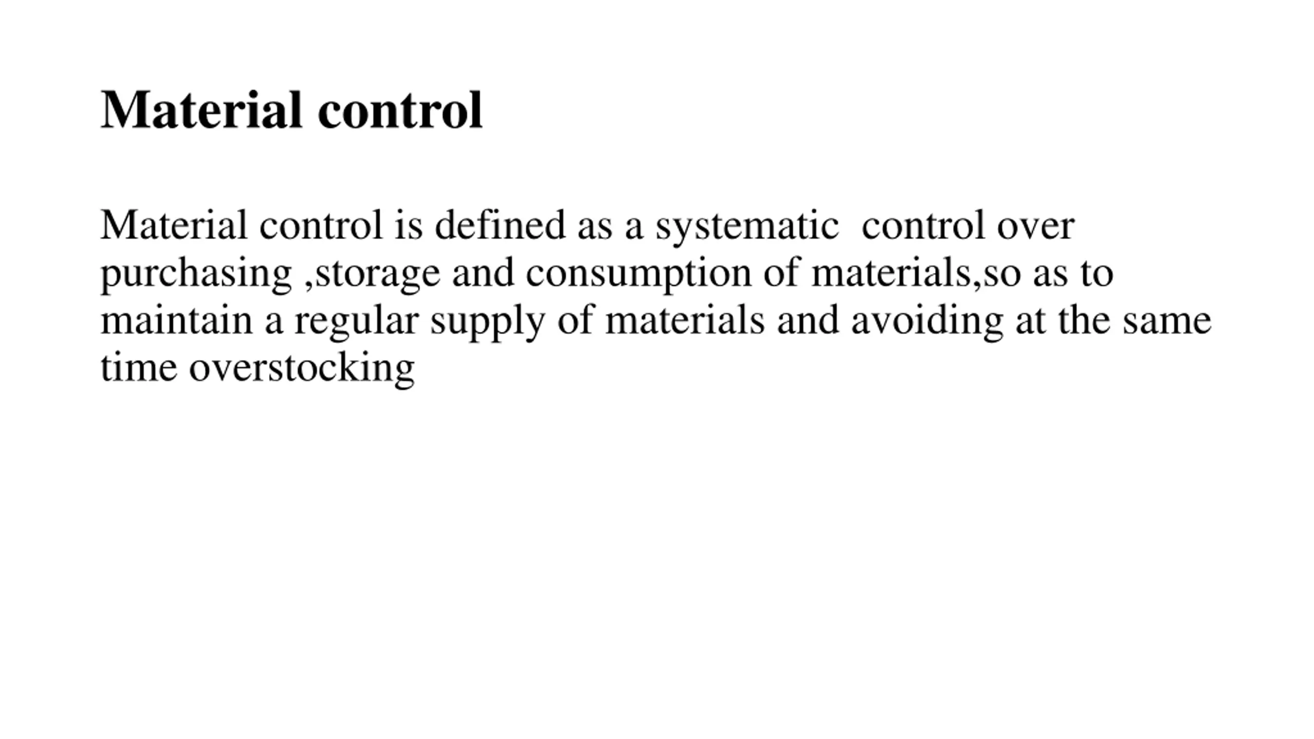 Material control Material control is defined as a systematic control over purchasing ,storage and consumption of materials,so as to maintain a regular supply of materials and avoiding at the same time overstocking