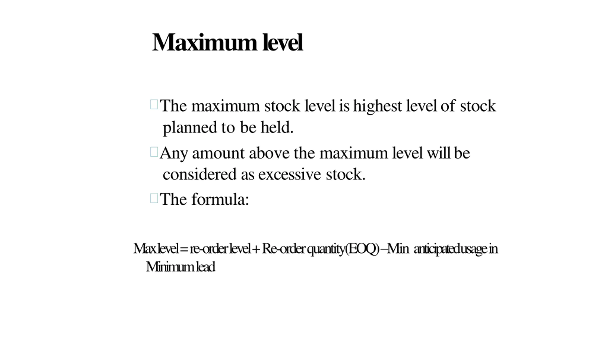 Maximumlevel The maximum stock level is highest level of stock planned to be held. Any amount above the maximum level will be considered as excessive stock. The formula: Max level = re-order level + Re-order quantity(EOQ) Min anticipated usage in Minimumlead