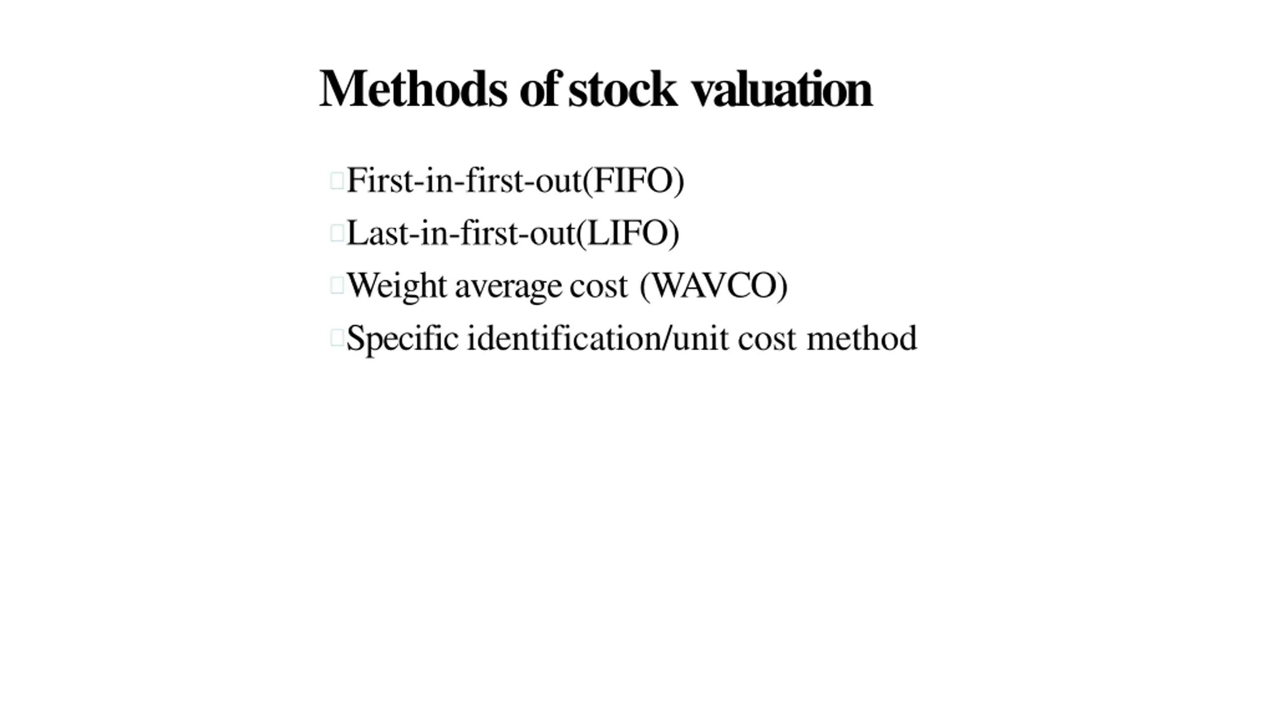 Methods of stock valuation First-in-first-out(FIFO) Last-in-first-out(LIFO) Weight average cost (WAVCO) Specific identification/unit cost method