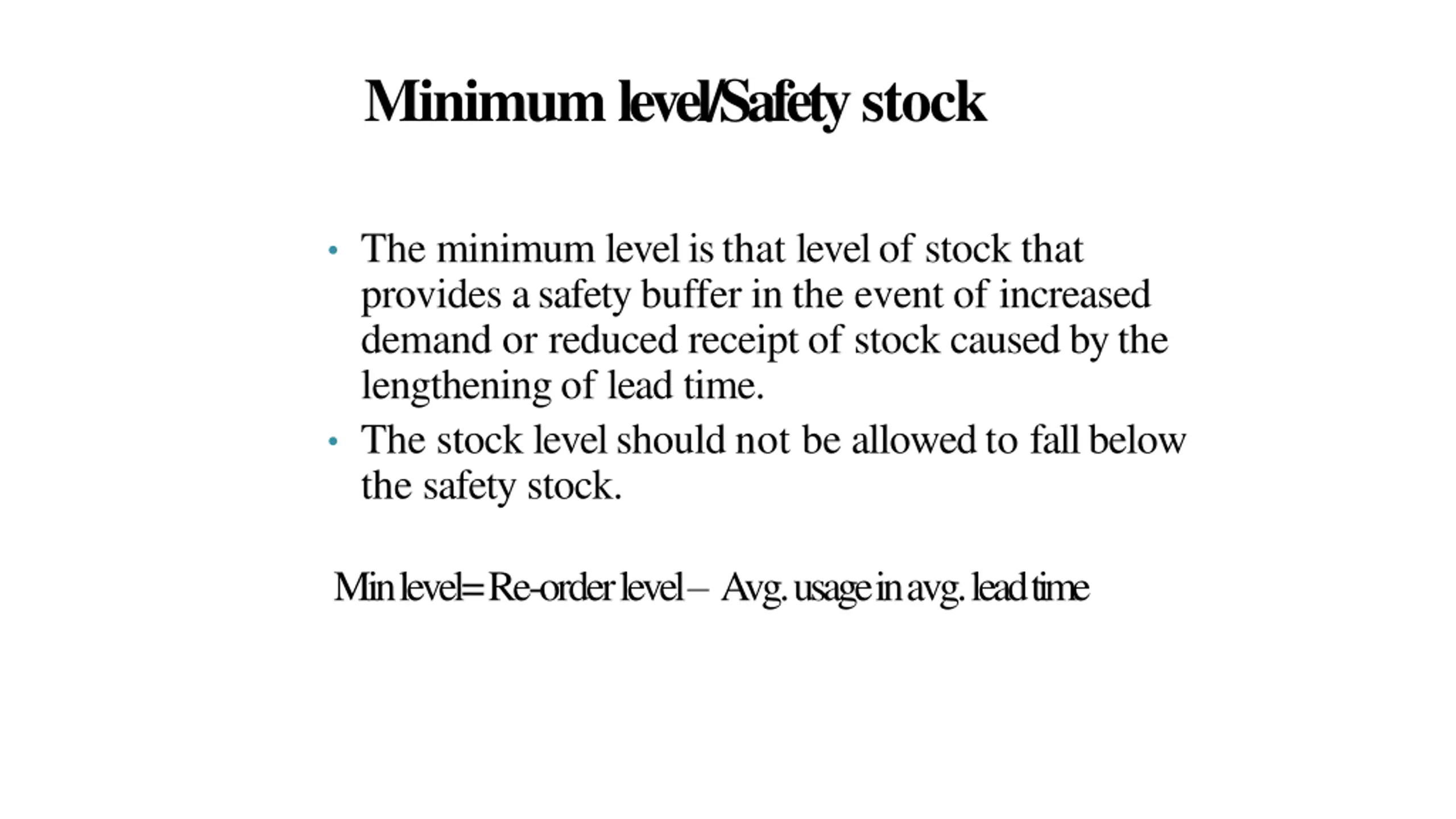 Minimum level/Safetystock The minimum level is that level of stock that provides a safety buffer in the event of increased demand or reduced receipt of stock caused by the lengthening of lead time. The stock level should not be allowed to fall below the safety stock. Min level= Re-order level Avg. usage in avg. lead time