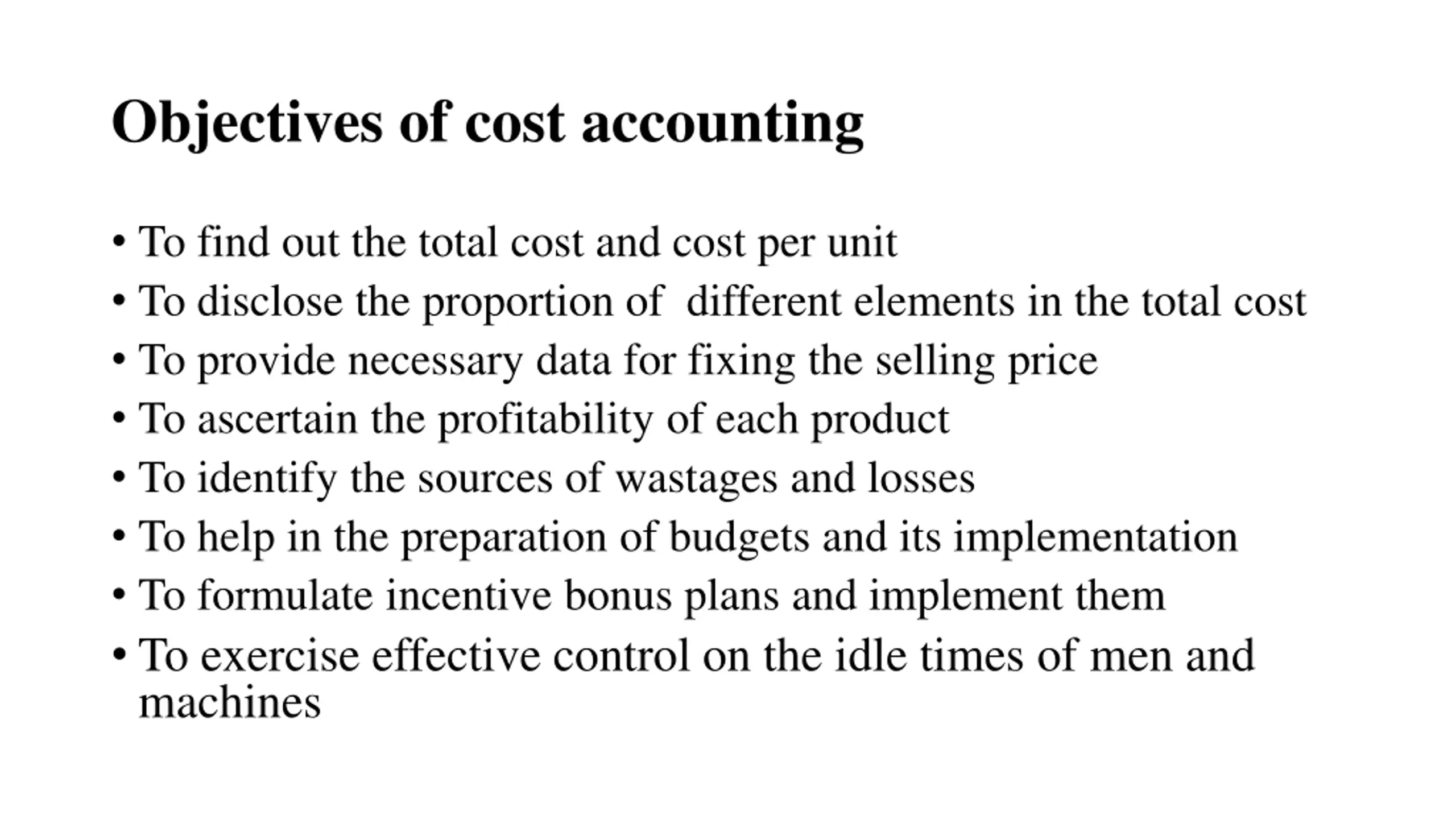 Objectives of cost accounting To find out the total cost and cost per unit To disclose the proportion of different elements in the total cost To provide necessary data for fixing the selling price To ascertain the profitability of each product To identify the sources of wastages and losses To help in the preparation of budgets and its implementation To formulate incentive bonus plans and implement them To exercise effective control on the idle times of men and machines