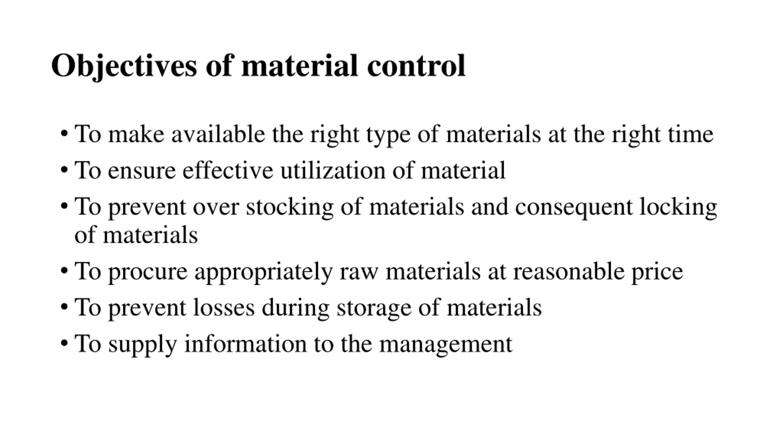 Objectives of material control To make available the right type of materials at the right time To ensure effective utilization of material To prevent over stocking of materials and consequent locking of materials To procure appropriately raw materials at reasonable price To prevent losses during storage of materials To supply information to the management