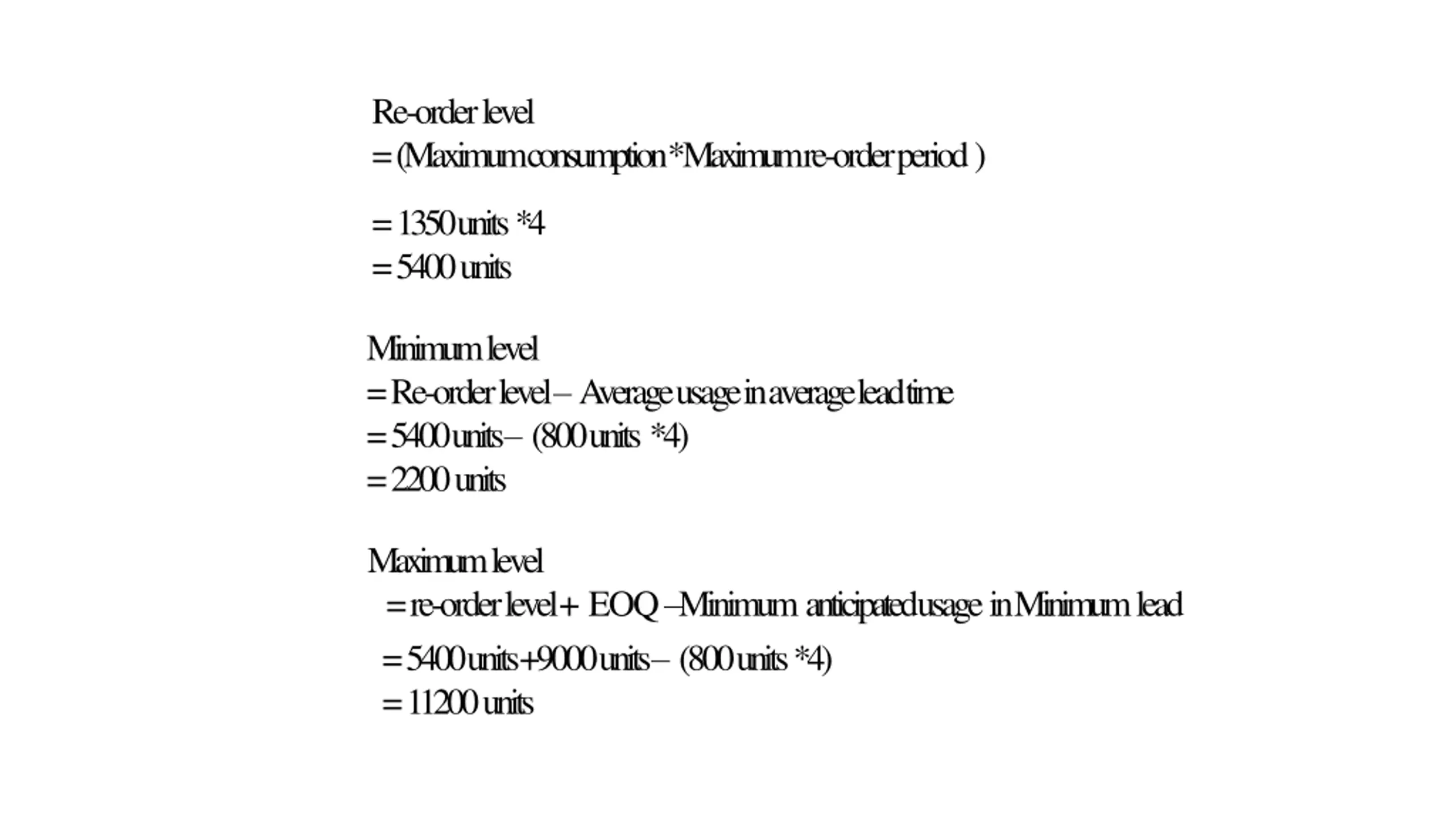 Re-orderlevel = (Maximum consumption * Maximum re-order period) = 1350 units*4 = 5400units Minimumlevel = Re-order level Average usage in average lead time = 5400 units (800 units *4) = 2200units Maximumlevel = re-order level + EOQ Minimum anticipated usage in Minimumlead = 5400 units +9000 units (800 units*4) = 11200units