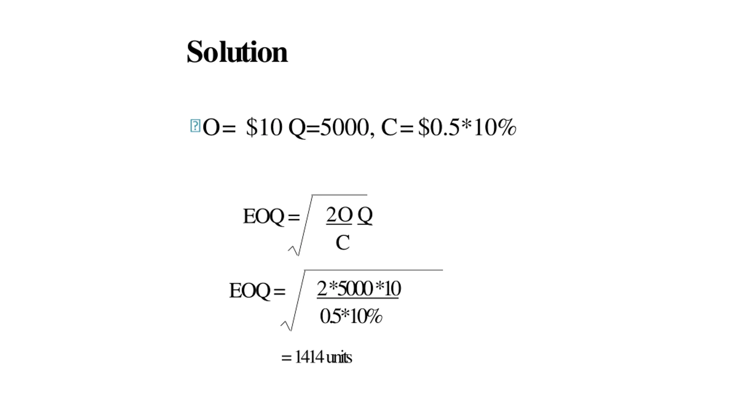 Solution O= $10 Q=5000, C=$0.5*10% 2 OQ C EOQ = 2 * 5000*10 0.5*10% EOQ= = 1414units