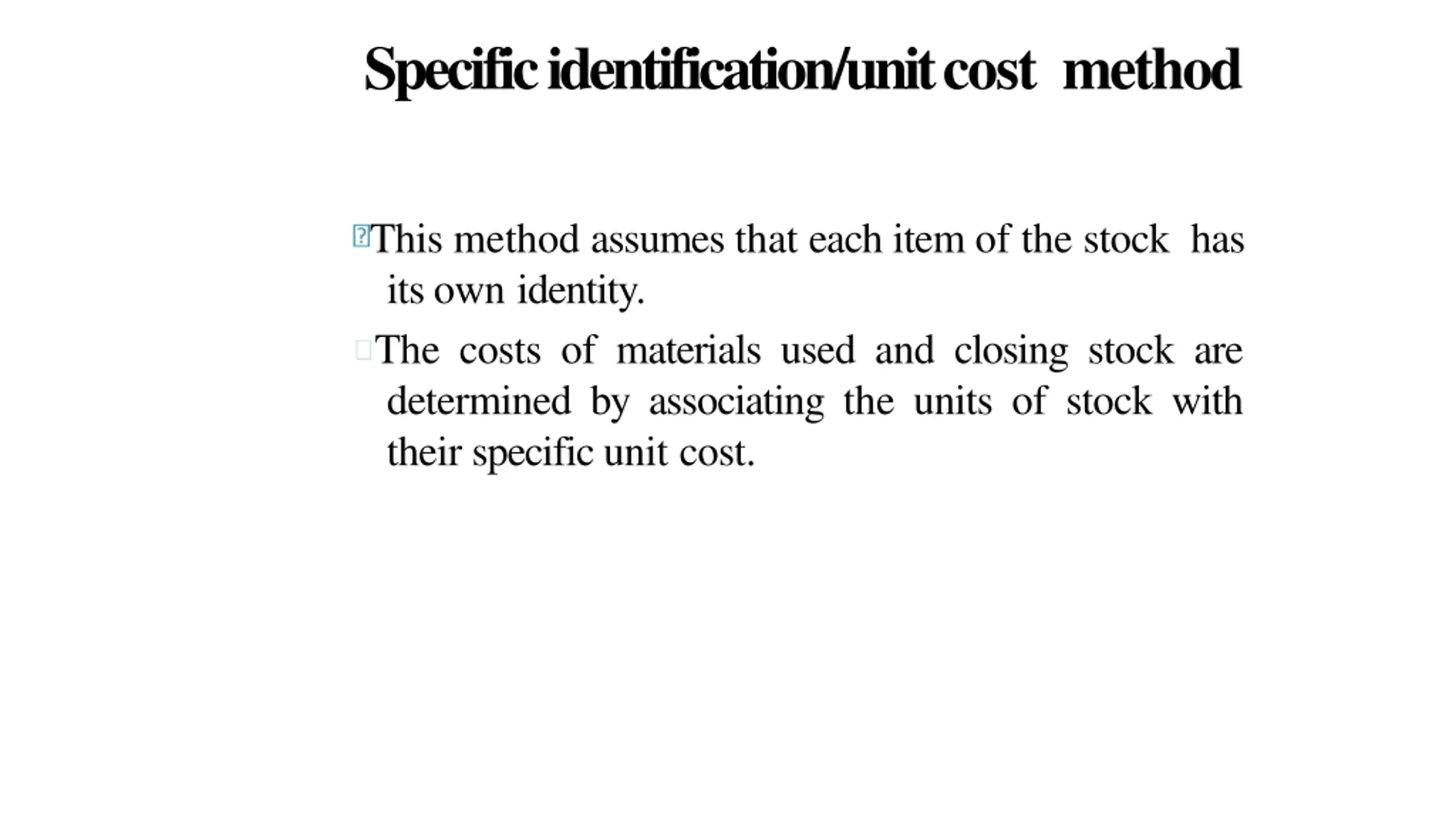 Specific identification/unit cost method This method assumes that each item of the stock has its own identity. The costs of materials used and closing stock are determined by associating the units of stock with their specificunit cost.