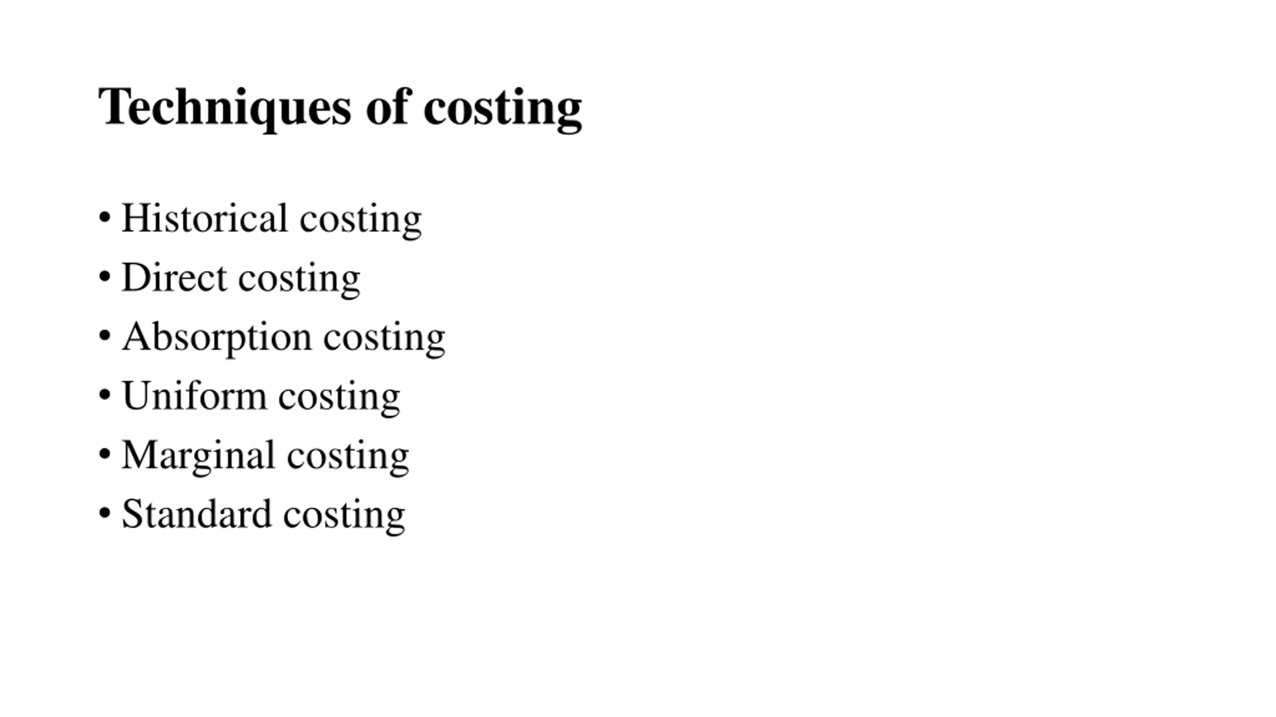 Techniques of costing Historical costing Direct costing Absorption costing Uniform costing Marginal costing Standard costing