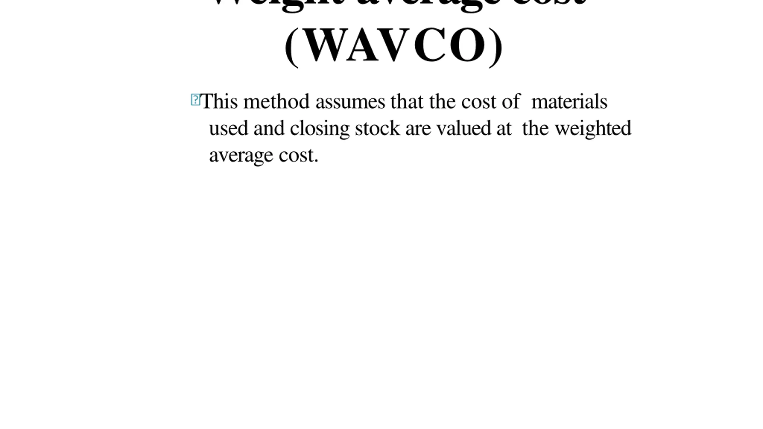 Weight average cost (WAVCO) This method assumes that the cost of materials used and closing stock are valued at the weighted average cost.