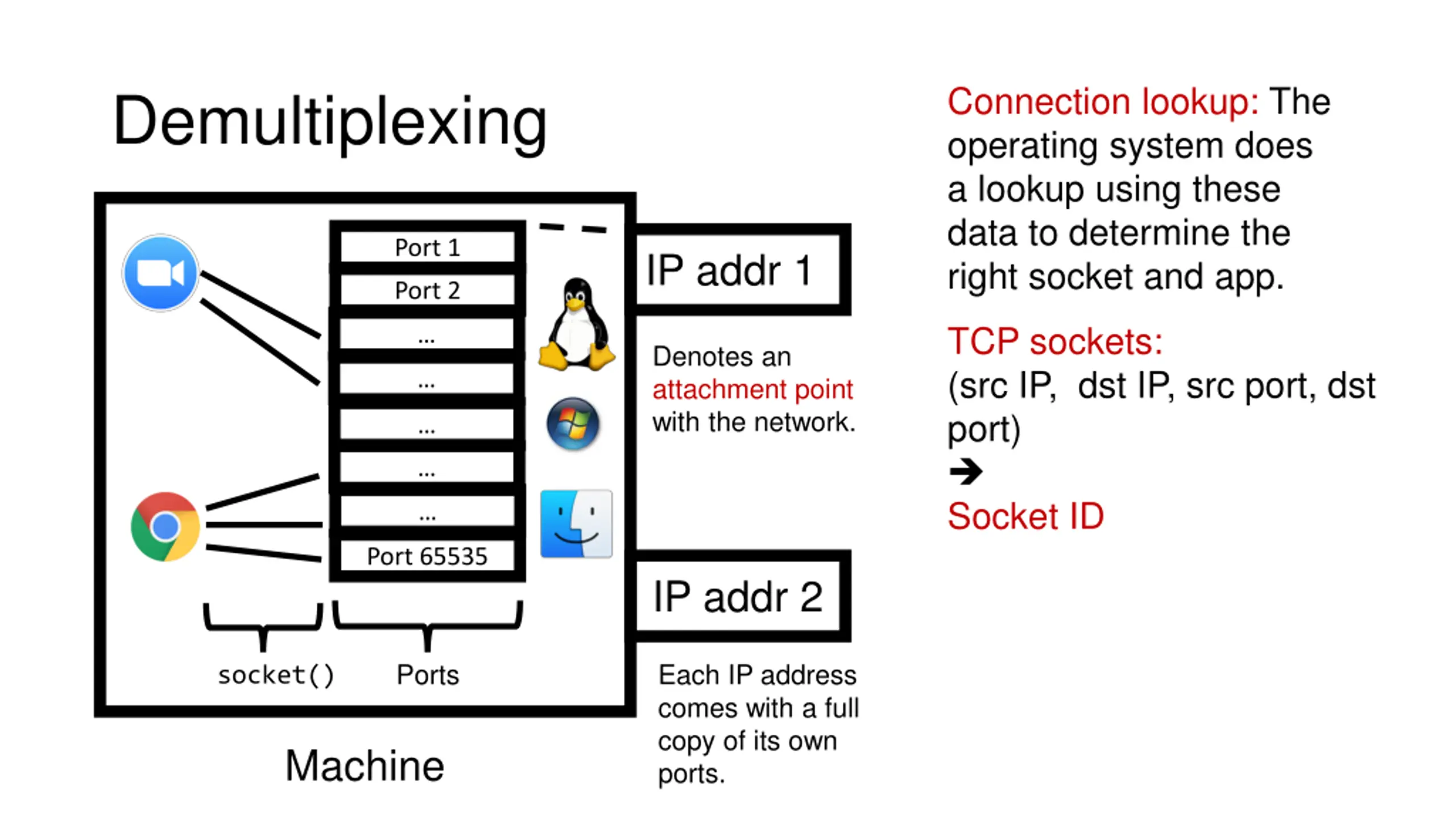 Connection lookup: The operating system does a lookup using these data to determine the right socket and app. TCP sockets: (src IP, dst IP, src port, dst port) Socket ID Demultiplexing Port 1 Machine 1 IP addr 1 Port 2 Denotes an attachment point with the network. Machine 1 Port 65535 Machine 1 IP addr 2 Ports Each IP address comes with a full copy of its own ports. socket() Machine