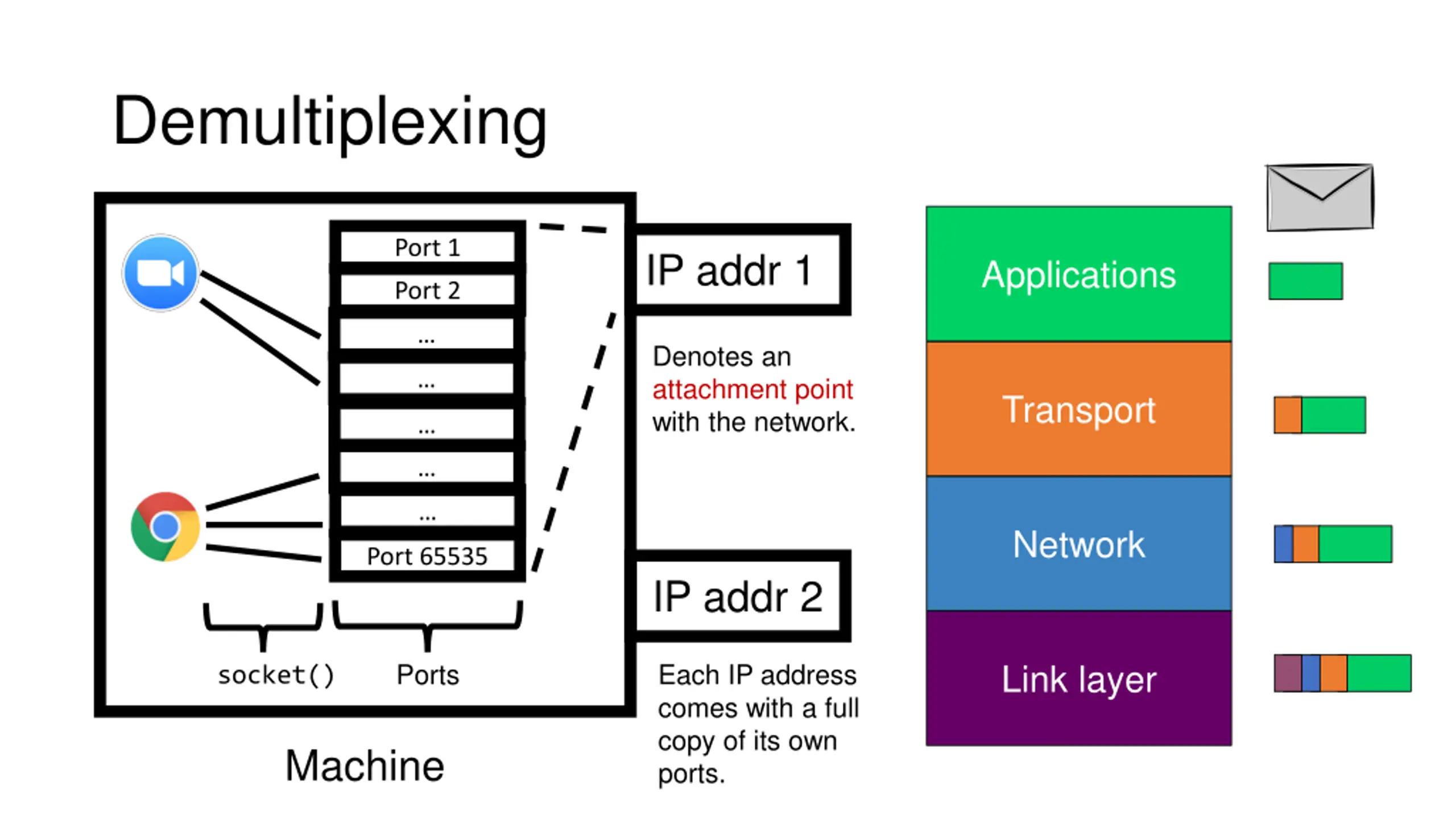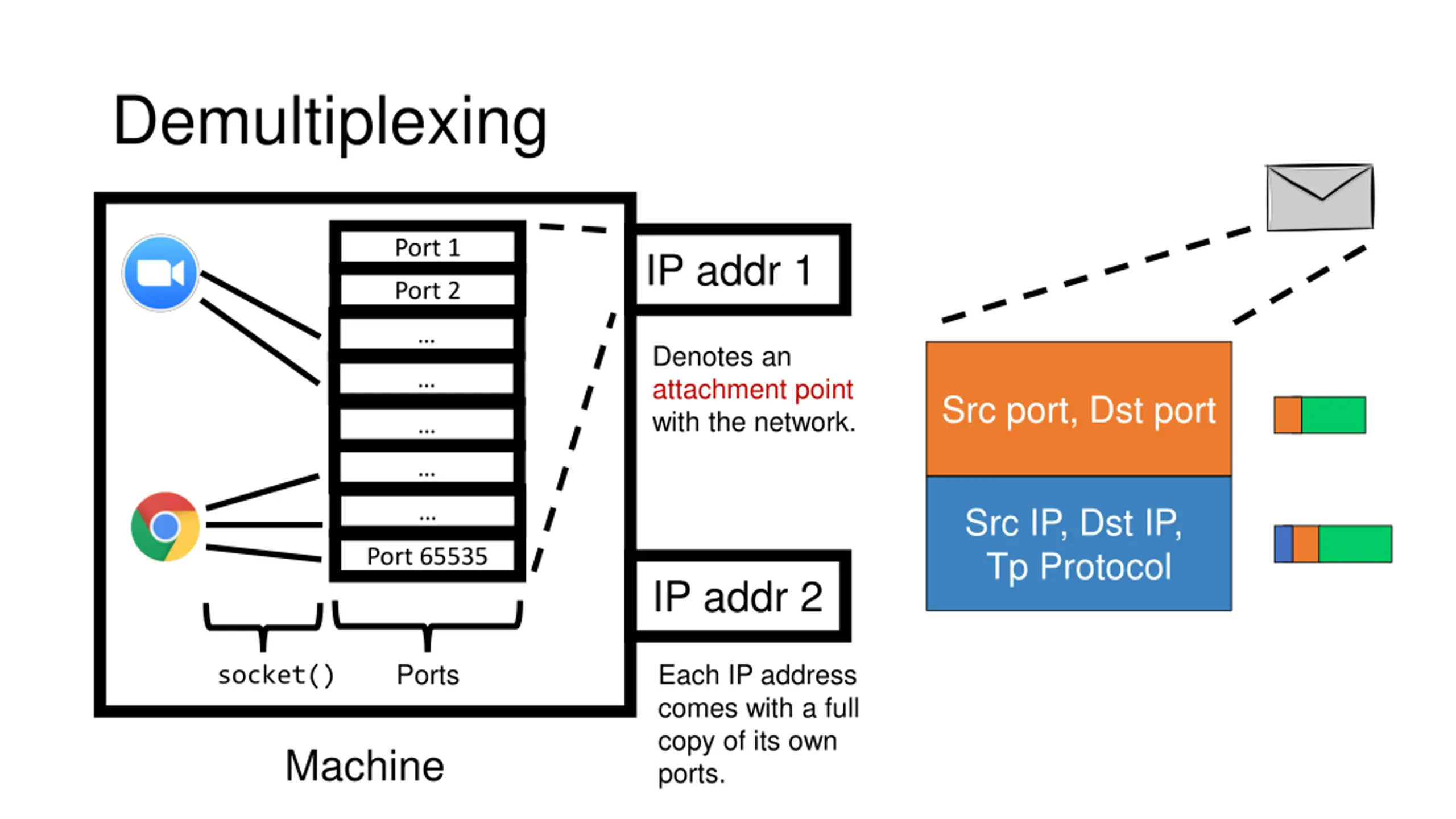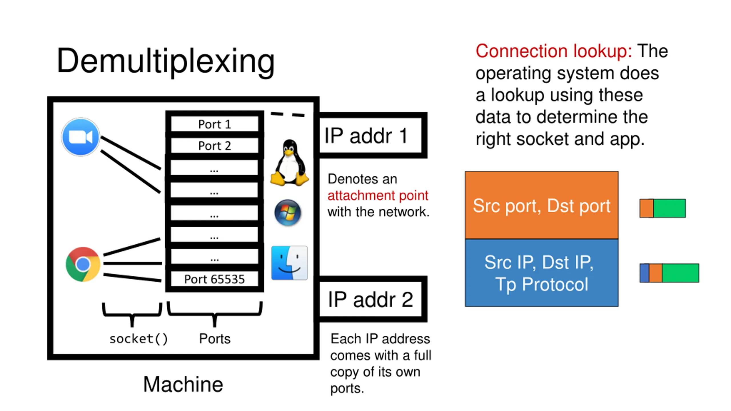 Connection lookup: The operating system does a lookup using these data to determine the right socket and app. Demultiplexing Port 1 Machine 1 IP addr 1 Port 2 Denotes an attachment point with the network. Src port, Dst port Machine 1 Src IP, Dst IP, Tp Protocol Port 65535 Machine 1 IP addr 2 Ports Each IP address comes with a full copy of its own ports. socket() Machine