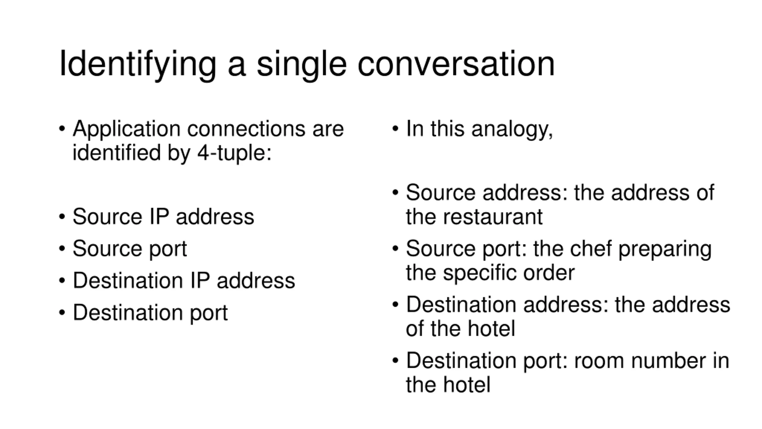 Identifying a single conversation Application connections are identified by 4-tuple: In this analogy, Source address: the address of the restaurant Source port: the chef preparing the specific order Destination address: the address of the hotel Destination port: room number in the hotel Source IP address Source port Destination IP address Destination port
