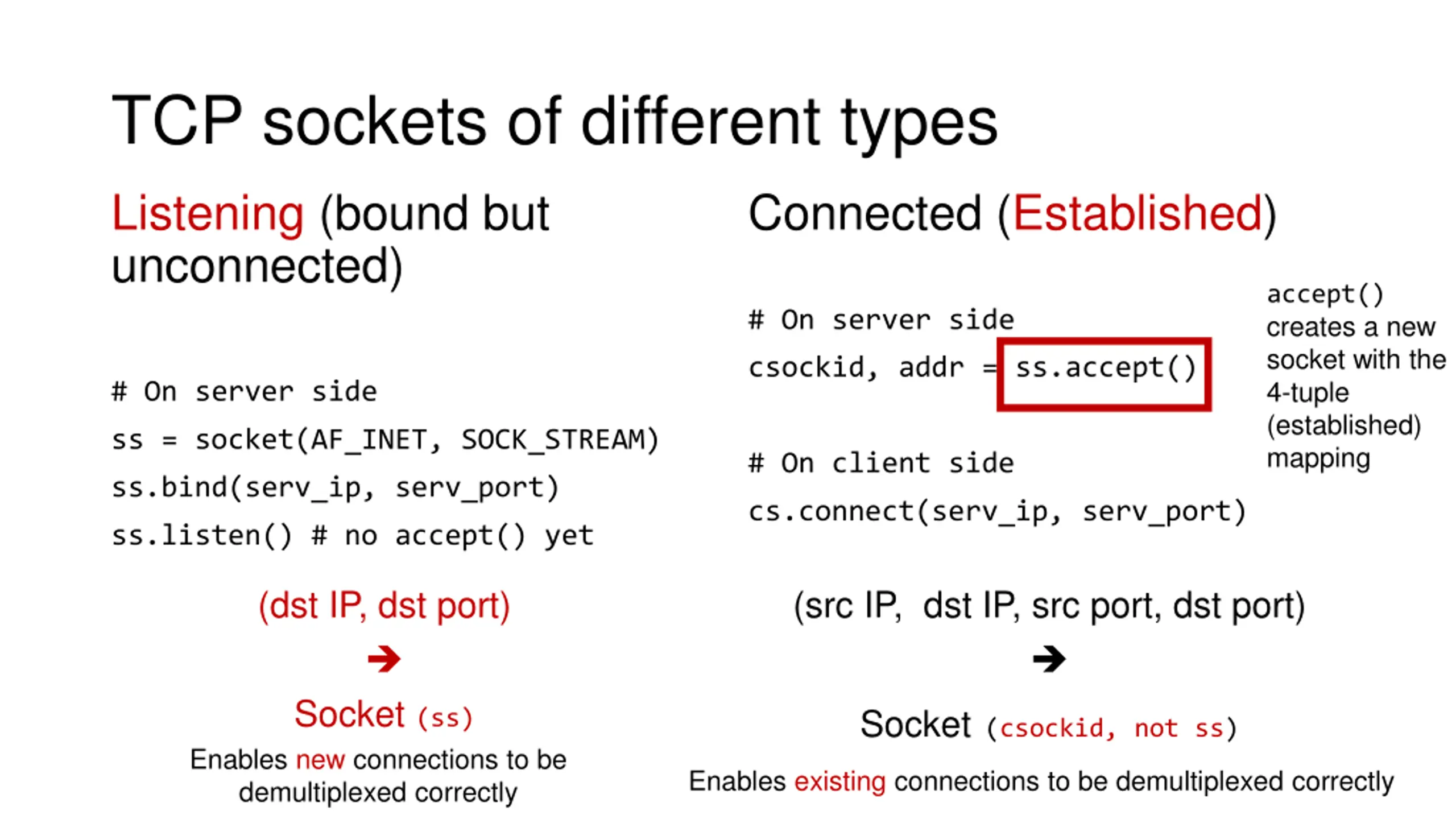 TCP sockets of different types Listening (bound but unconnected) Connected (Established) accept() creates a new socket with the 4-tuple (established) mapping # On server side csockid, addr = ss.accept() # On server side ss = socket(AF_INET, SOCK_STREAM) # On client side ss.bind(serv_ip, serv_port) cs.connect(serv_ip, serv_port) ss.listen() # no accept() yet (dst IP, dst port) Socket (ss) Enables new connections to be demultiplexed correctly (src IP, dst IP, src port, dst port) Socket(csockid, not ss) Enables existing connections to be demultiplexed correctly