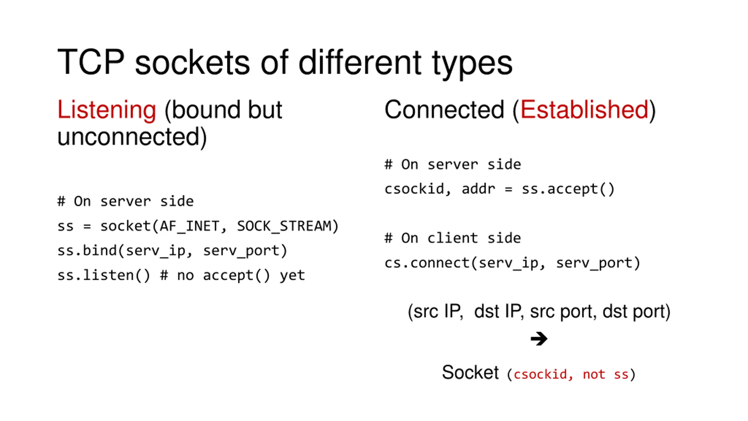 TCP sockets of different types Listening (bound but unconnected) Connected (Established) # On server side csockid, addr = ss.accept() # On server side ss = socket(AF_INET, SOCK_STREAM) # On client side ss.bind(serv_ip, serv_port) cs.connect(serv_ip, serv_port) ss.listen() # no accept() yet (src IP, dst IP, src port, dst port) Socket(csockid, not ss)