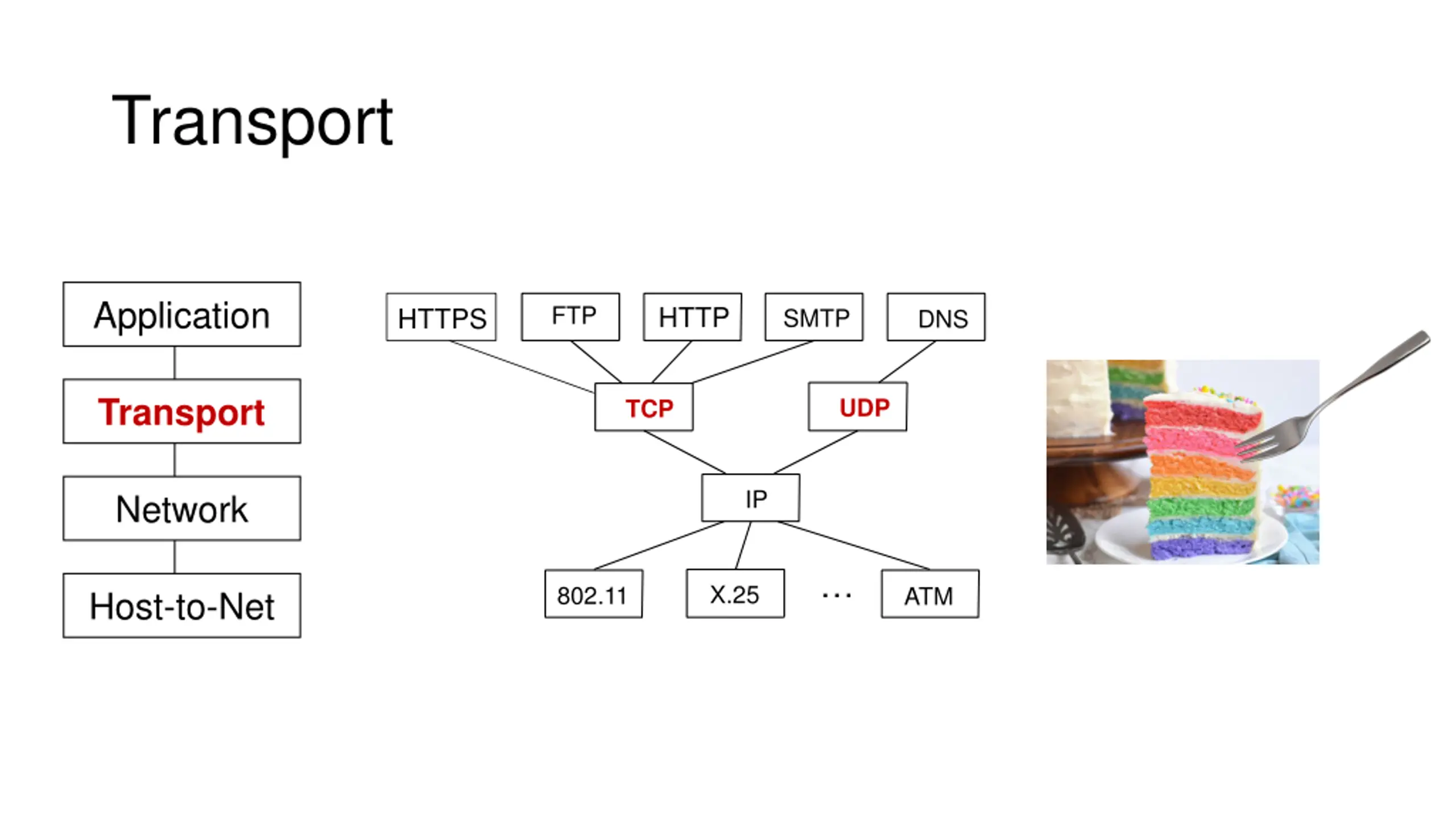 Two popular transports Transmission Control Protocol (TCP) Connection-based: the application remembers the other process talking to it. Suitable for longer-term, contextual data transfers, like HTTP, file transfers, etc. Guarantees: reliability, ordering, congestion control User Datagram Protocol (UDP) Connectionless: app doesn t remember the last process or source that talked to it. Suitable for single req/resp flows, like DNS. Guarantees: basic error detection