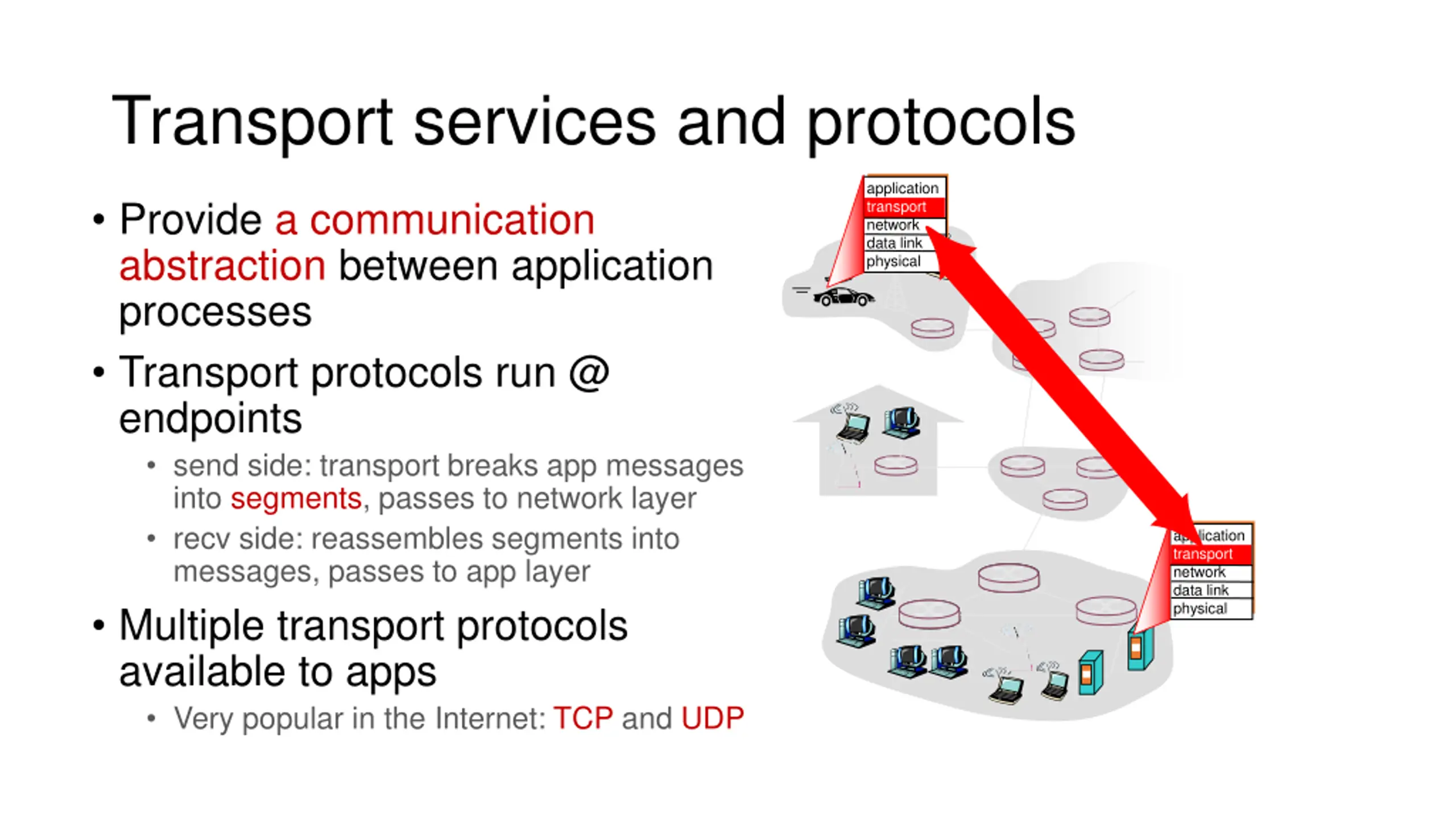 Transport services and protocols application transport network data link physical Providea communication abstraction between application processes Transport protocols run @ endpoints send side: transport breaks app messages into segments, passes to network layer recv side: reassembles segments into messages, passes to app layer Multiple transport protocols available to apps Very popular in the Internet: TCP and UDP application transport network data link physical