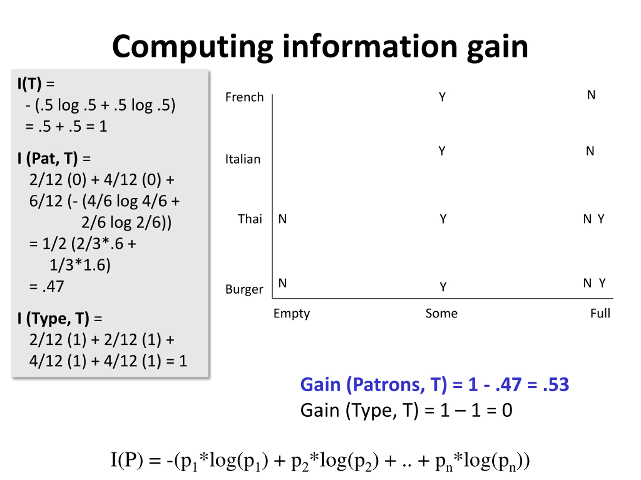 Computing information gain I(T) = - (.5 log .5 + .5 log .5) = .5 + .5 = 1 N French Y Y N I (Pat, T) = 2/12 (0) + 4/12 (0) + 6/12 (- (4/6 log 4/6 + 2/6 log 2/6)) = 1/2 (2/3*.6 + 1/3*1.6) = .47 Italian Thai N Y N Y N N Y Y Burger Empty Some Full I (Type, T) = 2/12 (1) + 2/12 (1) + 4/12 (1) + 4/12 (1) = 1 Gain (Patrons, T) = 1 - .47 = .53 Gain (Type, T) = 1 1 = 0 I(P) = -(p1*log(p1) + p2*log(p2) + .. + pn*log(pn))