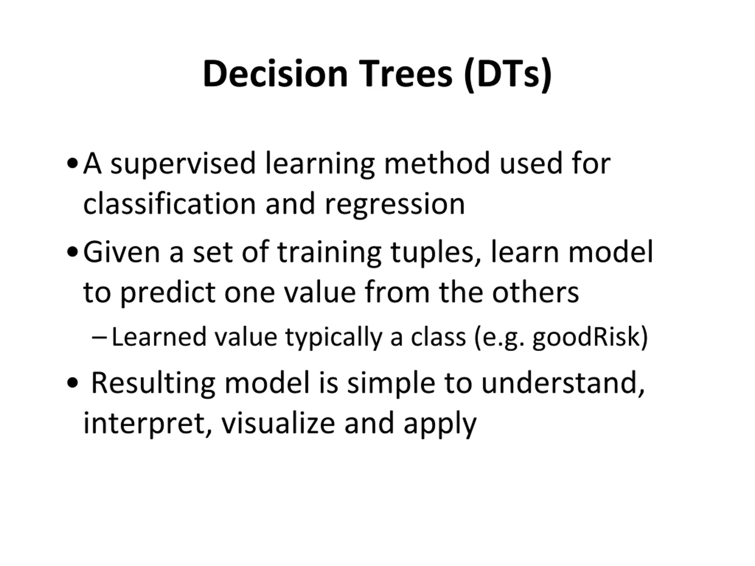 Decision Trees (DTs) A supervised learning method used for classification and regression Given a set of training tuples, learn model to predict one value from the others Learned value typically a class (e.g. goodRisk) Resulting model is simple to understand, interpret, visualize and apply