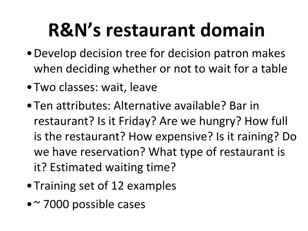 R&Ns restaurant domain Develop decision tree for decision patron makes when deciding whether or not to wait for a table Two classes: wait, leave Ten attributes: Alternative available? Bar in restaurant? Is it Friday? Are we hungry? How full is the restaurant? How expensive? Is it raining? Do we have reservation? What type of restaurant is it? Estimated waiting time? Training set of 12 examples ~ 7000 possible cases