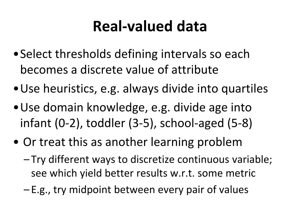 Real-valued data Select thresholds defining intervals so each becomes a discrete value of attribute Use heuristics, e.g. always divide into quartiles Use domain knowledge, e.g. divide age into infant (0-2), toddler (3-5), school-aged (5-8) Or treat this as another learning problem Try different ways to discretize continuous variable; see which yield better results w.r.t. some metric E.g., try midpoint between every pair of values