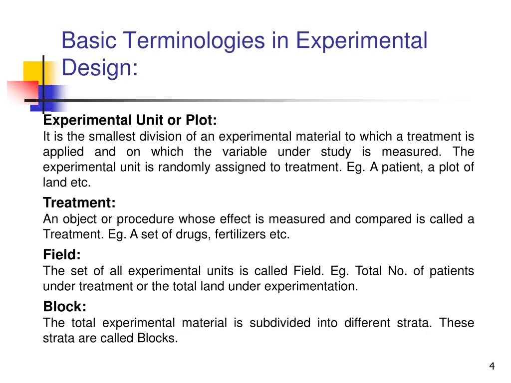 Basic Terminologies in Experimental Design: Experimental Unit or Plot: It is the smallest division of an experimental material to which a treatment is applied and on which the variable under study is measured. The experimental unit is randomly assigned to treatment. Eg. A patient, a plot of land etc. Treatment: An object or procedure whose effect is measured and compared is called a Treatment. Eg. A set of drugs, fertilizers etc. Field: The set of all experimental units is called Field. Eg. Total No. of patients under treatment or the total land under experimentation. Block: The total experimental material is subdivided into different strata. These strata are called Blocks. 4