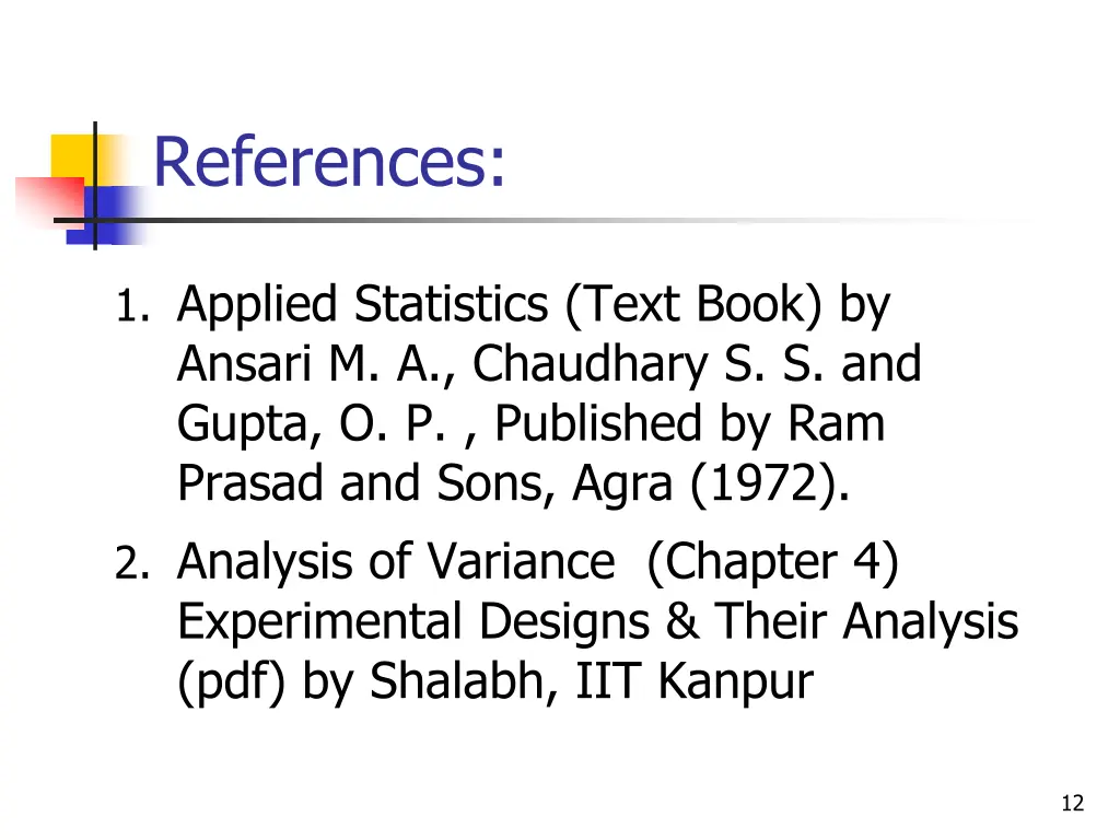 References: 1. Applied Statistics (Text Book) by Ansari M. A., Chaudhary S. S. and Gupta, O. P. , Published by Ram Prasad and Sons, Agra (1972). 2. Analysis of Variance (Chapter 4) Experimental Designs & Their Analysis (pdf) by Shalabh, IIT Kanpur 12