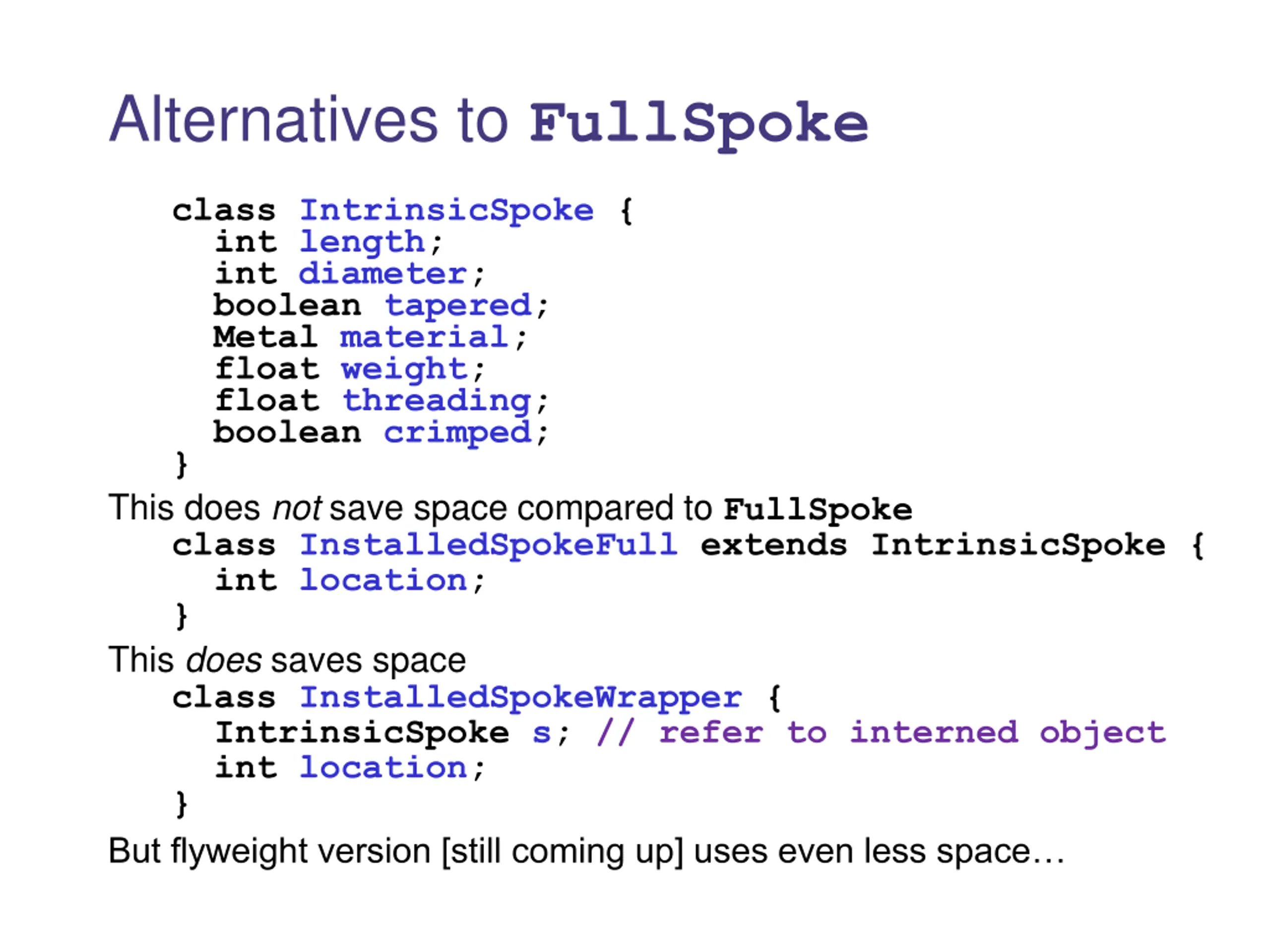 Alternatives to FullSpoke class IntrinsicSpoke { int length; int diameter; boolean tapered; Metal material; float weight; float threading; boolean crimped; } This does not save space compared to FullSpoke class InstalledSpokeFull extends IntrinsicSpoke { int location; } This does saves space class InstalledSpokeWrapper { IntrinsicSpoke s; // refer to interned object int location; } But flyweight version [still coming up] uses even less space