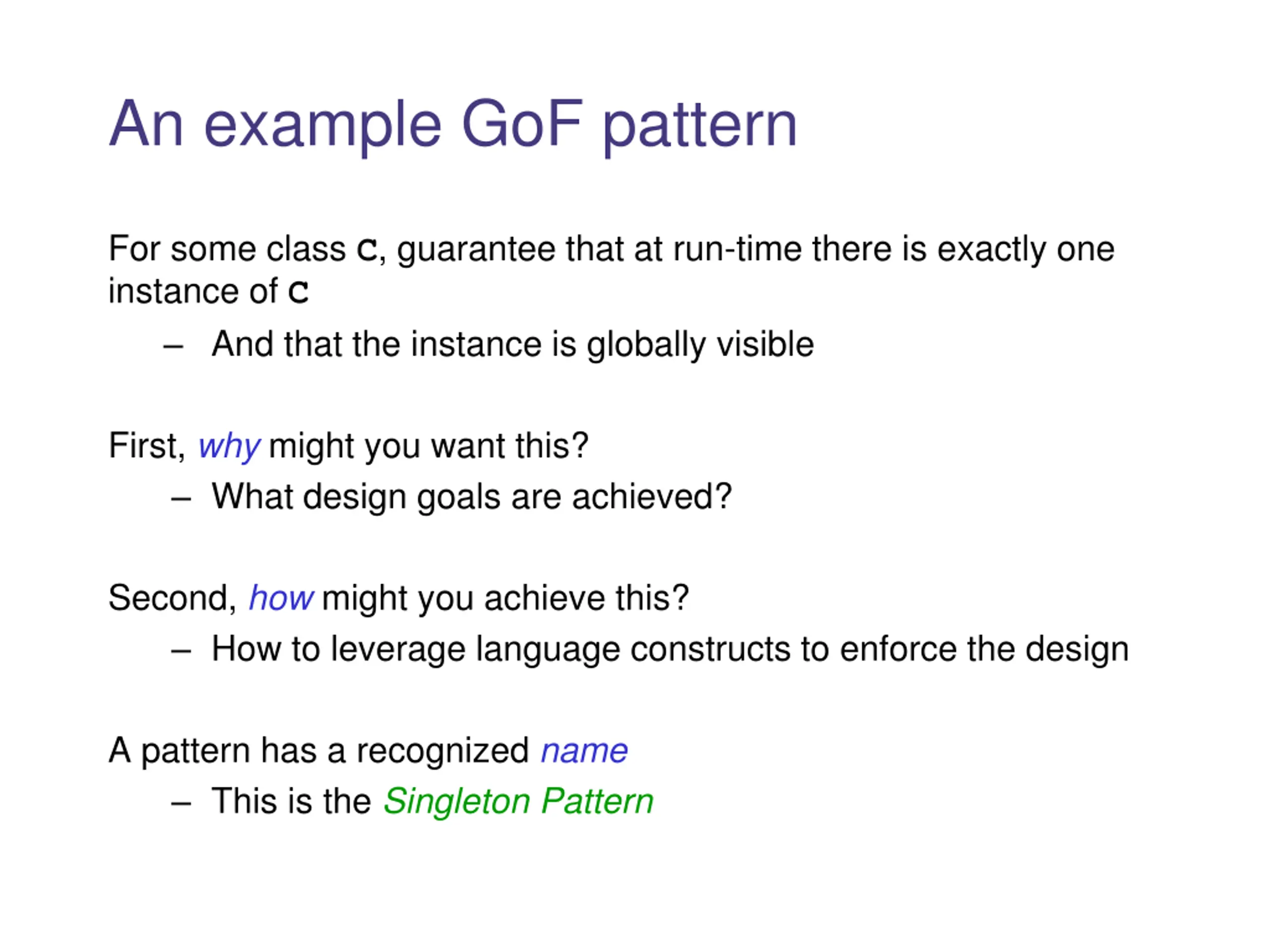 An example GoF pattern For some class C, guarantee that at run-time there is exactly one instance of C And that the instance is globally visible First, why might you want this? What design goals are achieved? Second, how might you achieve this? How to leverage language constructs to enforce the design A pattern has a recognized name This is the Singleton Pattern