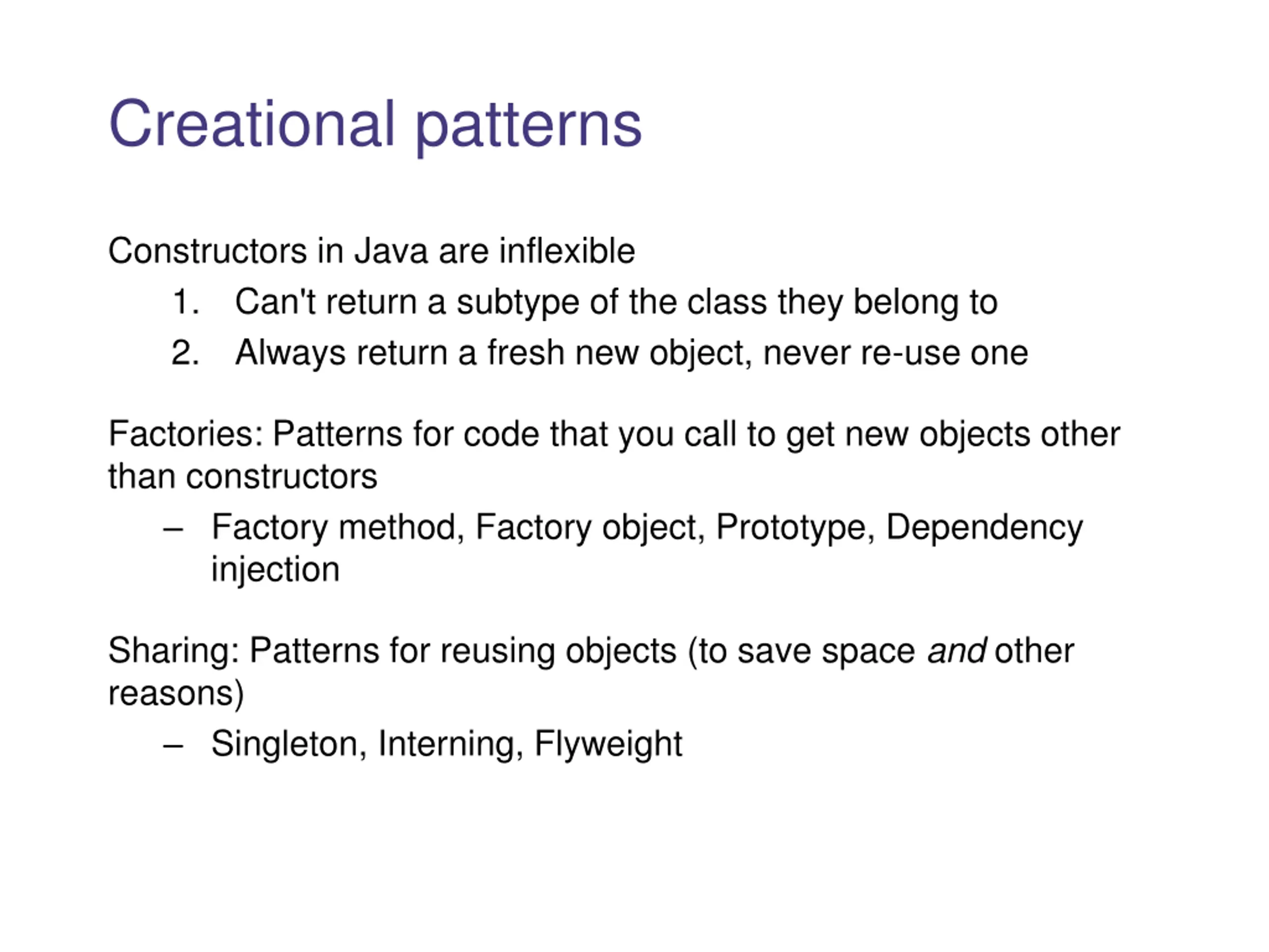 Creational patterns Constructors in Java are inflexible 1. Can't return a subtype of the class they belong to 2. Always return a fresh new object, never re-use one Factories: Patterns for code that you call to get new objects other than constructors Factory method, Factory object, Prototype, Dependency injection Sharing: Patterns for reusing objects (to save space and other reasons) Singleton, Interning, Flyweight