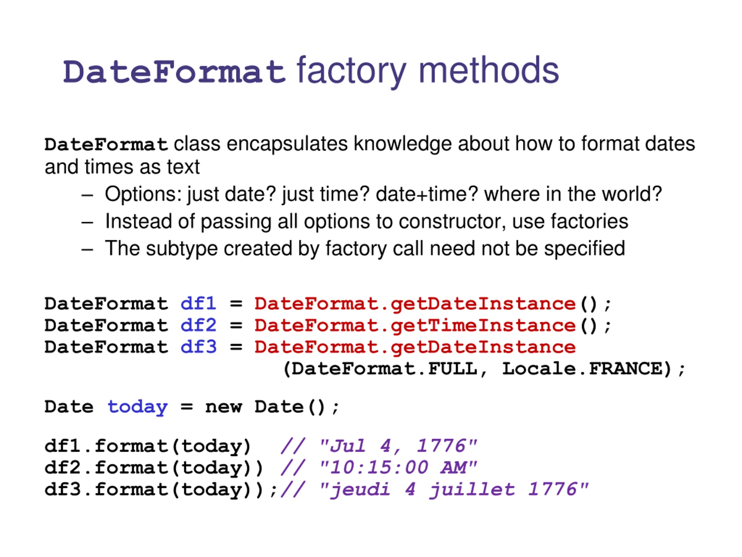 DateFormat factory methods DateFormat class encapsulates knowledge about how to format dates and times as text Options: just date? just time? date+time? where in the world? Instead of passing all options to constructor, use factories The subtype created by factory call need not be specified DateFormat df1 = DateFormat.getDateInstance(); DateFormat df2 = DateFormat.getTimeInstance(); DateFormat df3 = DateFormat.getDateInstance (DateFormat.FULL, Locale.FRANCE); Date today = new Date(); df1.format(today) // "Jul 4, 1776" df2.format(today)) // "10:15:00 AM" df3.format(today));// "jeudi 4 juillet 1776"