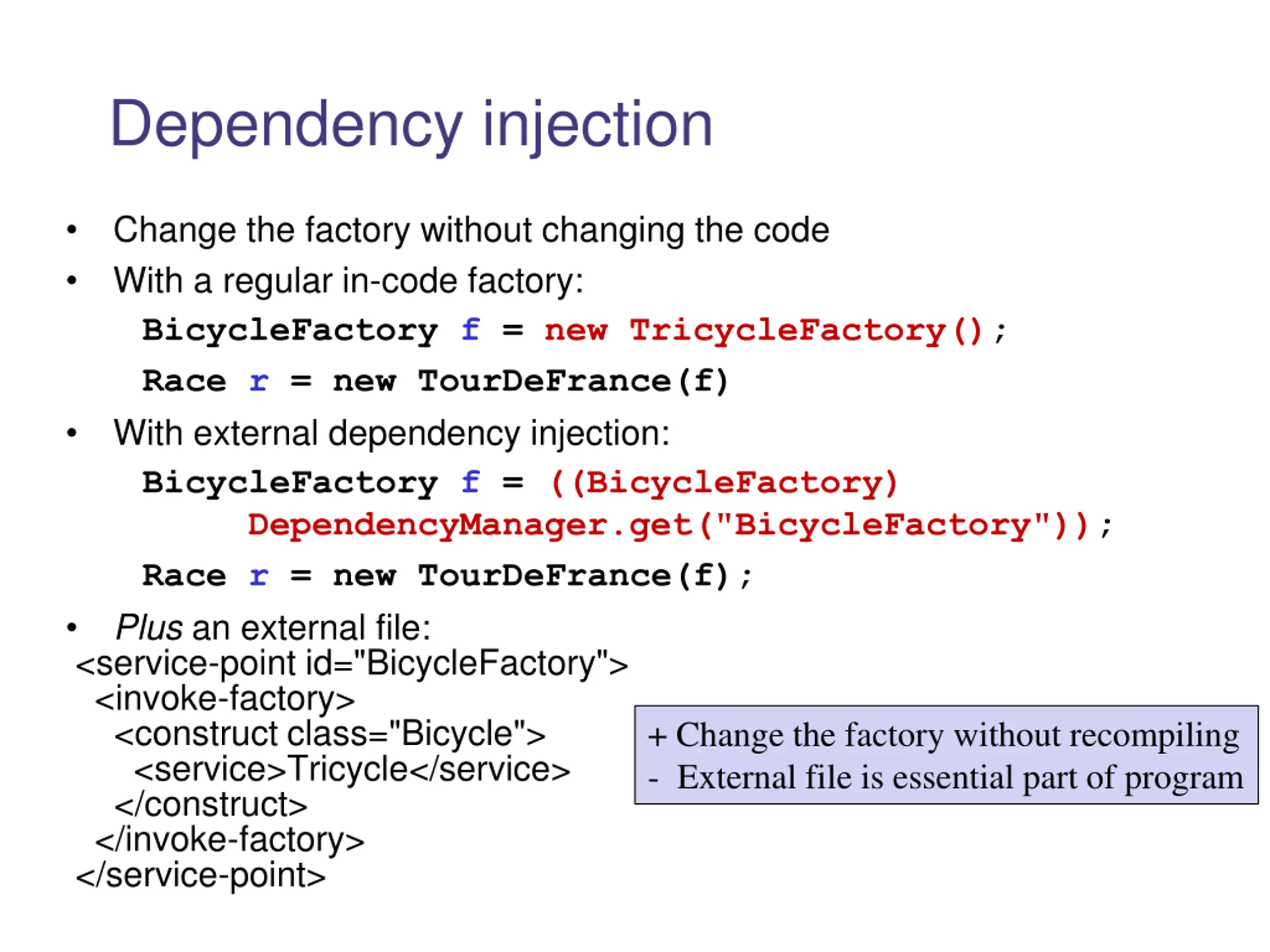 Dependency injection Change the factory without changing the code With a regular in-code factory: BicycleFactory f = new TricycleFactory(); Race r = new TourDeFrance(f) With external dependency injection: BicycleFactory f = ((BicycleFactory) DependencyManager.get("BicycleFactory")); Race r = new TourDeFrance(f); Plus an external file: <service-point id="BicycleFactory"> <invoke-factory> <construct class="Bicycle"> <service>Tricycle</service> </construct> </invoke-factory> </service-point> + Change the factory without recompiling - External file is essential part of program