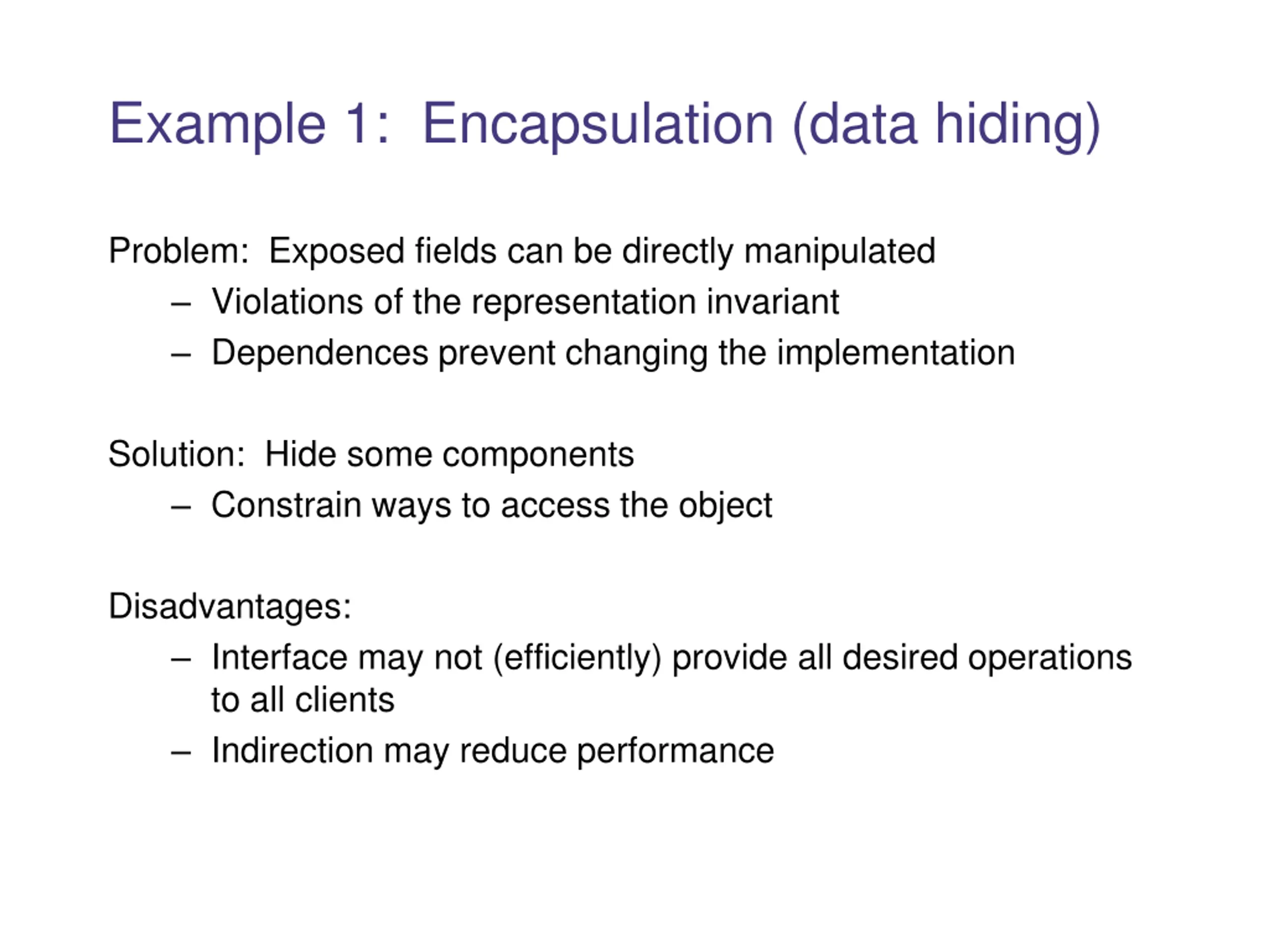 Example 1: Encapsulation (data hiding) Problem: Exposed fields can be directly manipulated Violations of the representation invariant Dependences prevent changing the implementation Solution: Hide some components Constrain ways to access the object Disadvantages: Interface may not (efficiently) provide all desired operations to all clients Indirection may reduce performance