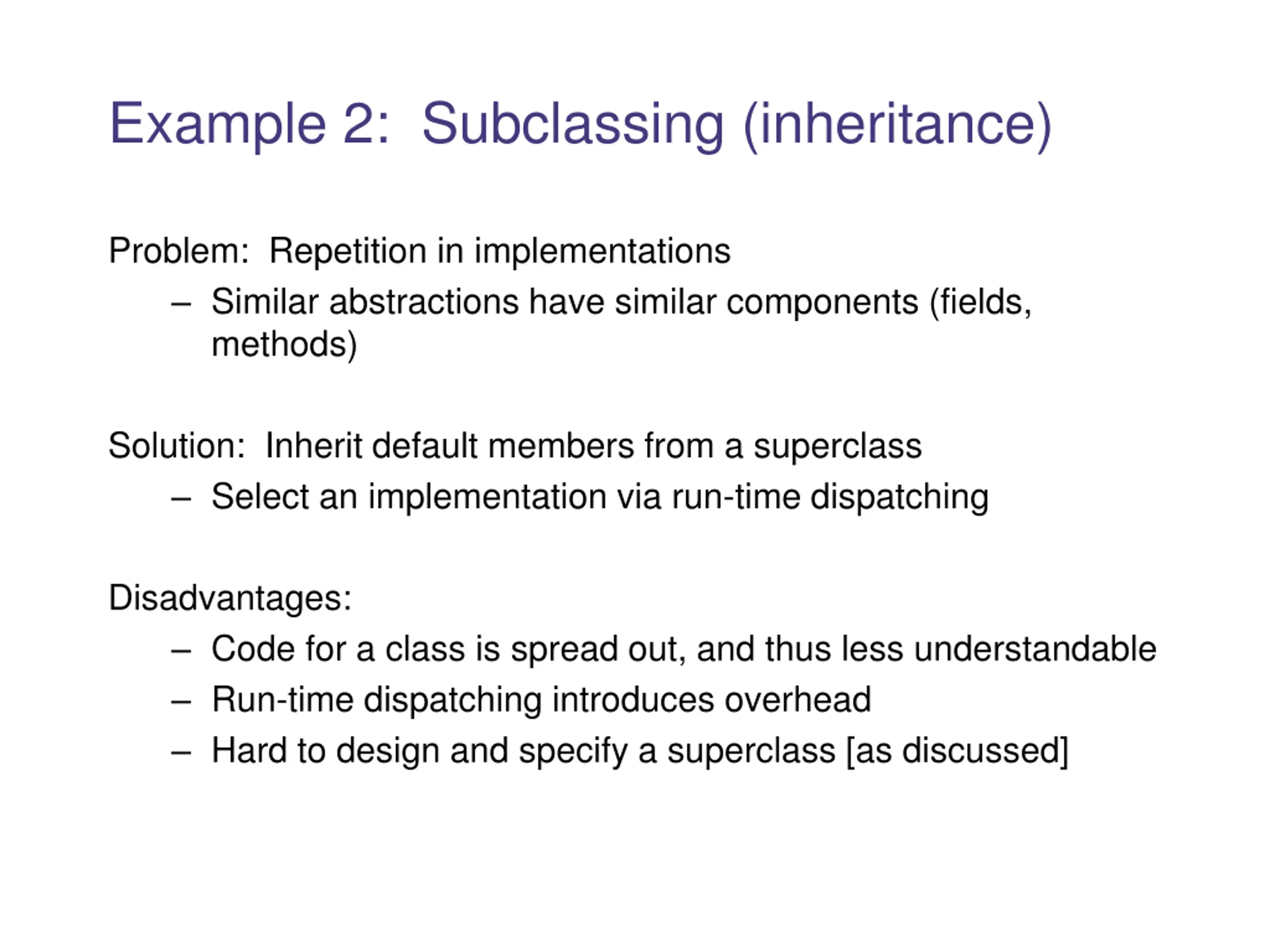 Example 2: Subclassing (inheritance) Problem: Repetition in implementations Similar abstractions have similar components (fields, methods) Solution: Inherit default members from a superclass Select an implementation via run-time dispatching Disadvantages: Code for a class is spread out, and thus less understandable Run-time dispatching introduces overhead Hard to design and specify a superclass [as discussed]