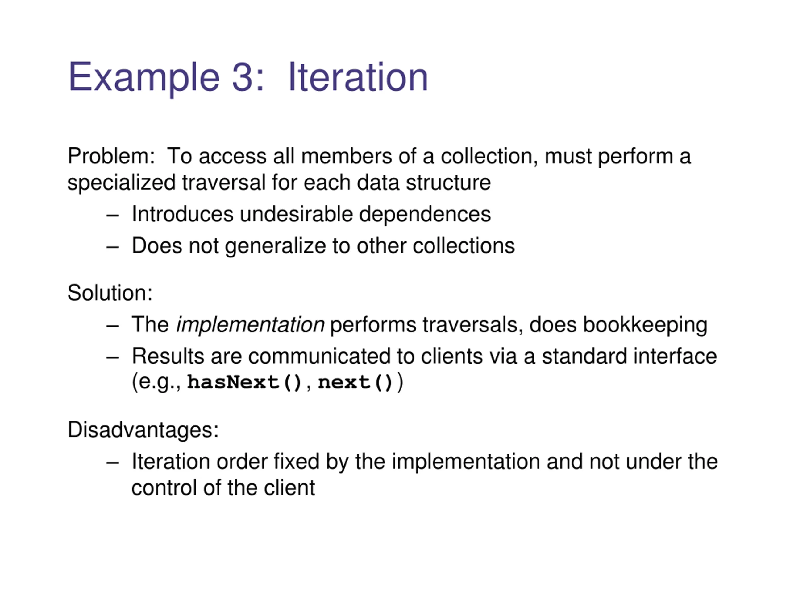 Example 3: Iteration Problem: To access all members of a collection, must perform a specialized traversal for each data structure Introduces undesirable dependences Does not generalize to other collections Solution: The implementation performs traversals, does bookkeeping Results are communicated to clients via a standard interface (e.g., hasNext(), next()) Disadvantages: Iteration order fixed by the implementation and not under the control of the client