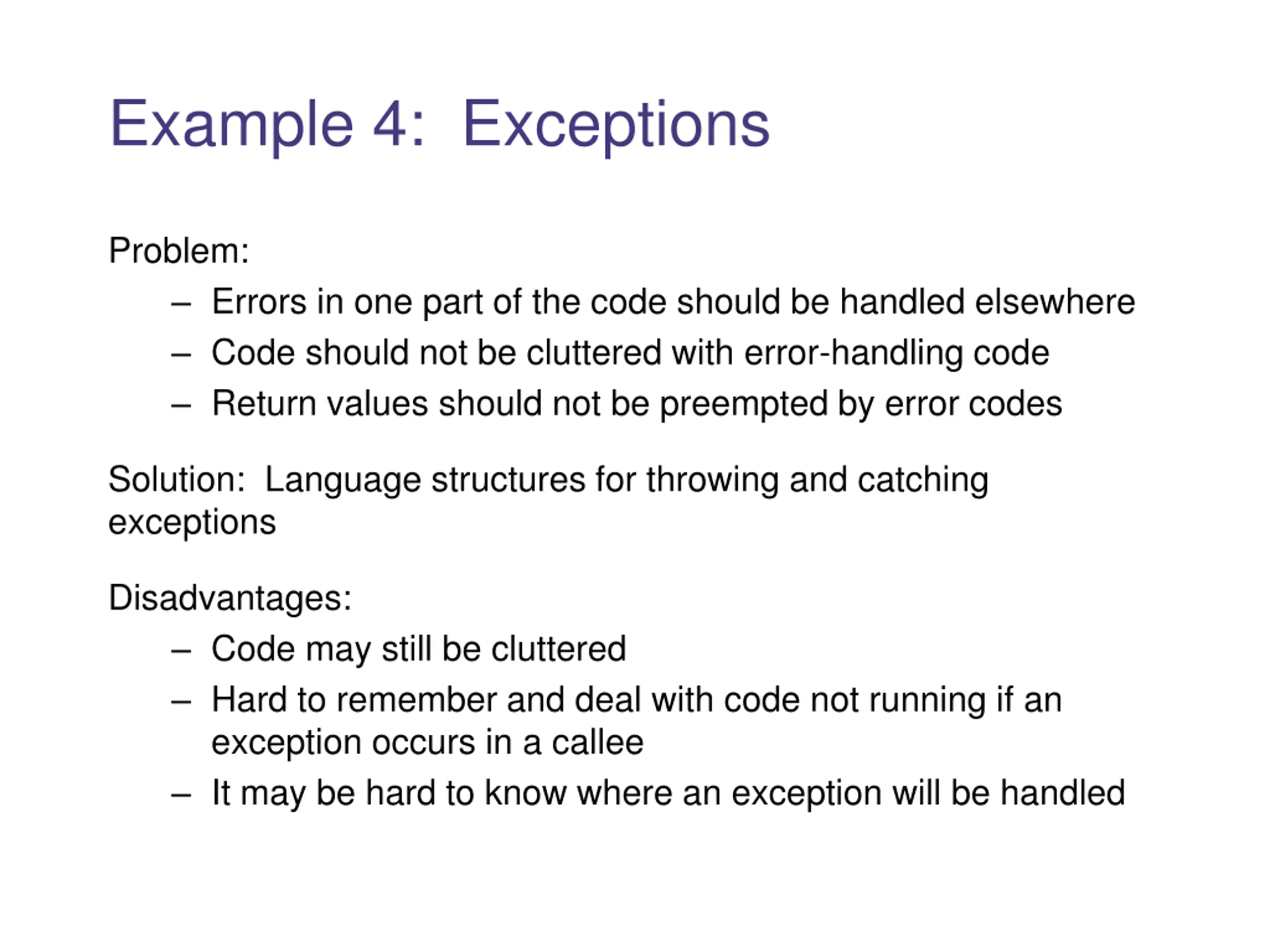 Example 4: Exceptions Problem: Errors in one part of the code should be handled elsewhere Code should not be cluttered with error-handling code Return values should not be preempted by error codes Solution: Language structures for throwing and catching exceptions Disadvantages: Code may still be cluttered Hard to remember and deal with code not running if an exception occurs in a callee It may be hard to know where an exception will be handled