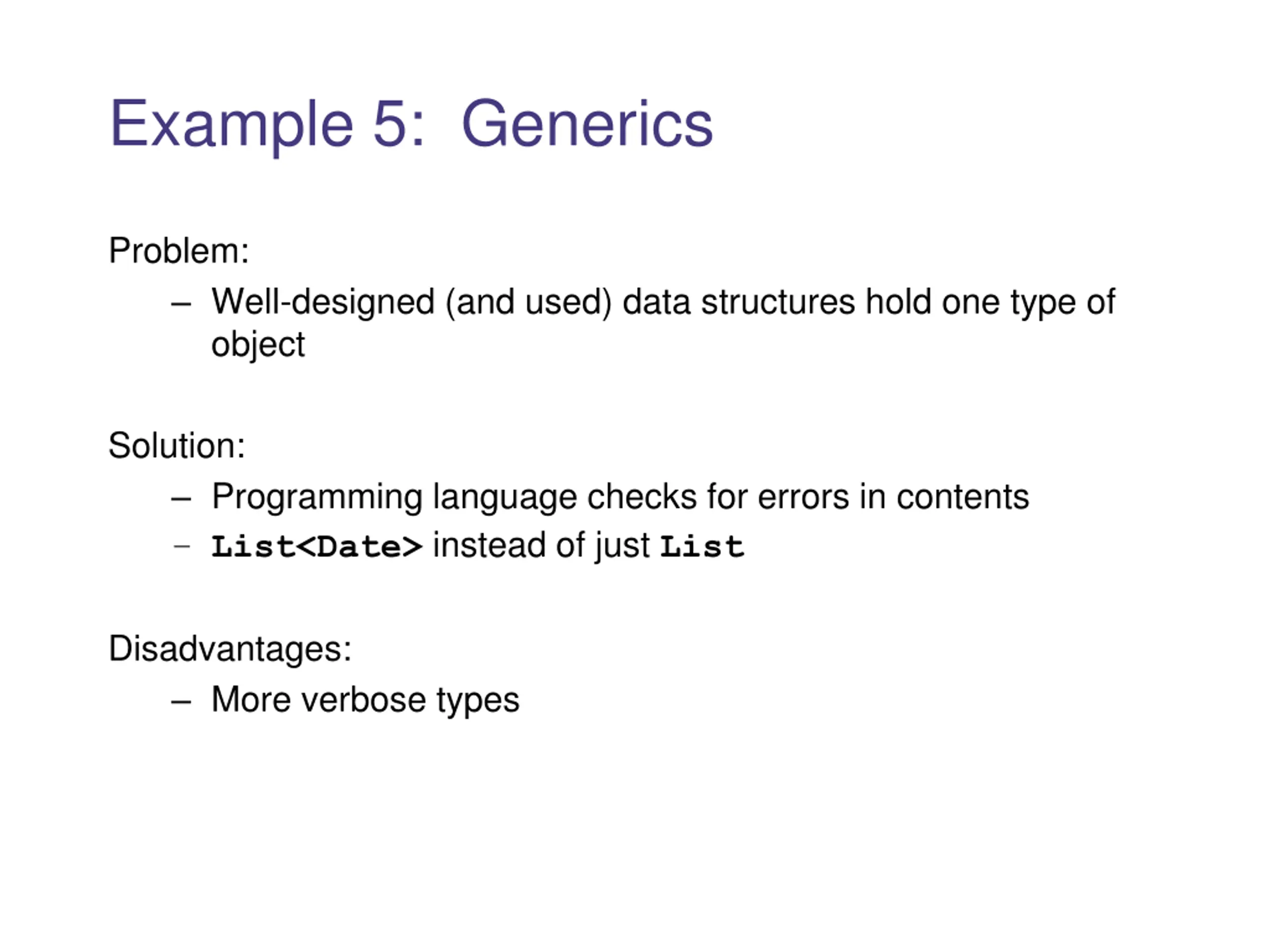 Example 5: Generics Problem: Well-designed (and used) data structures hold one type of object Solution: Programming language checks for errors in contents List<Date> instead of just List Disadvantages: More verbose types