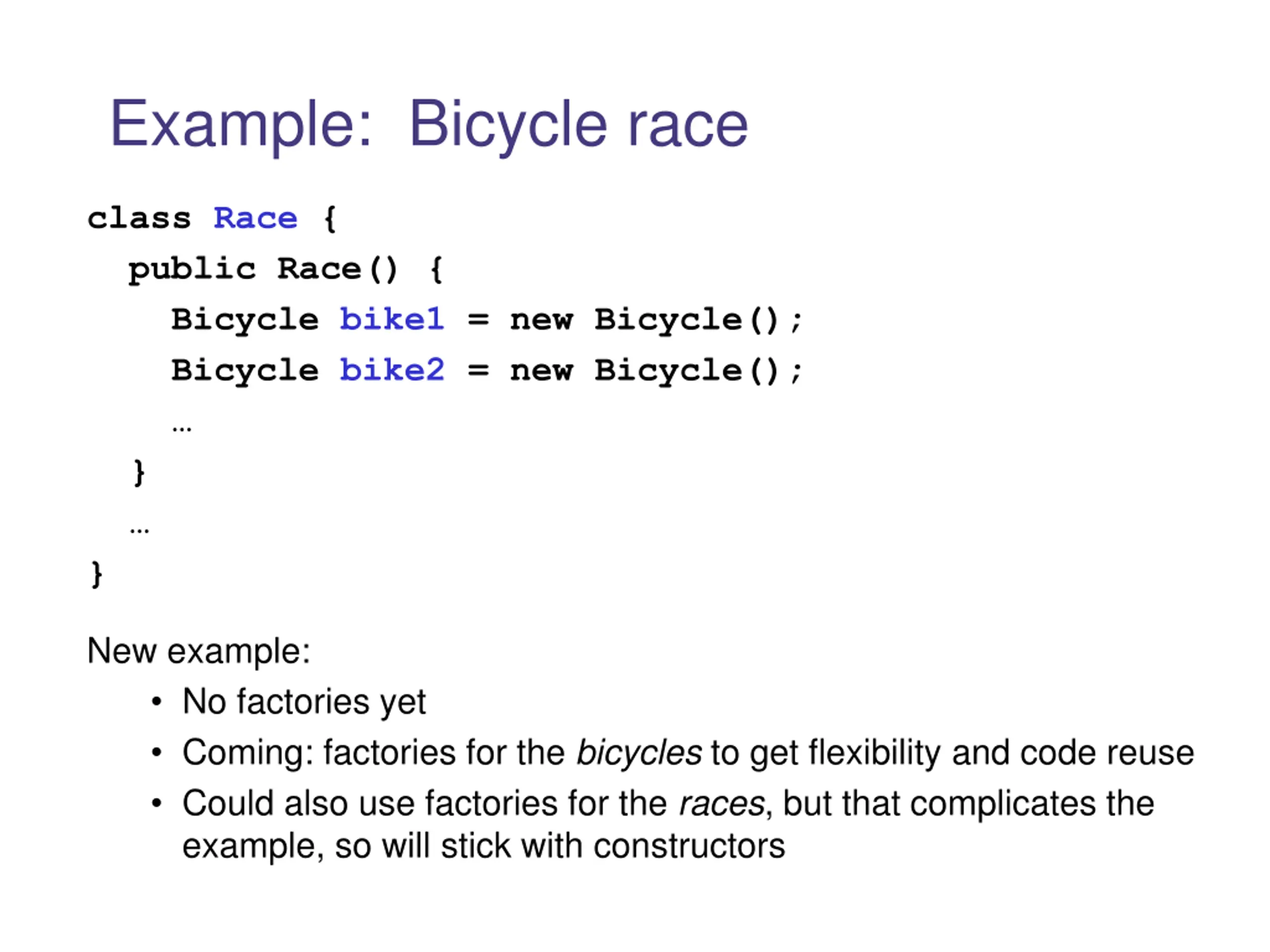 Example: Bicycle race class Race { public Race() { Bicycle bike1 = new Bicycle(); Bicycle bike2 = new Bicycle(); } } New example: No factories yet Coming: factories for the bicycles to get flexibility and code reuse Could also use factories for the races, but that complicates the example, so will stick with constructors