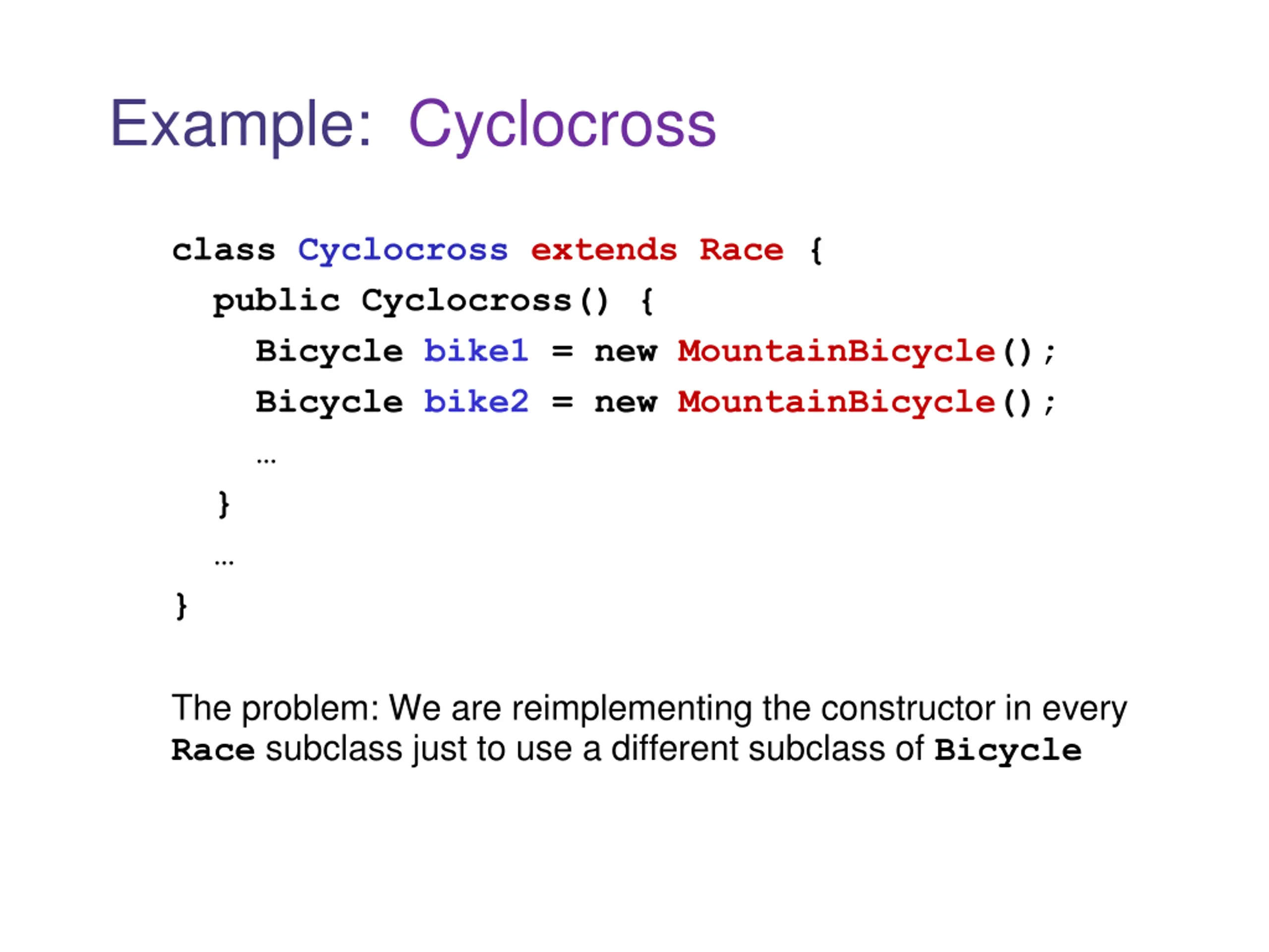 Example: Cyclocross class Cyclocross extends Race { public Cyclocross() { Bicycle bike1 = new MountainBicycle(); Bicycle bike2 = new MountainBicycle(); } } The problem: We are reimplementing the constructor in every Race subclass just to use a different subclass of Bicycle