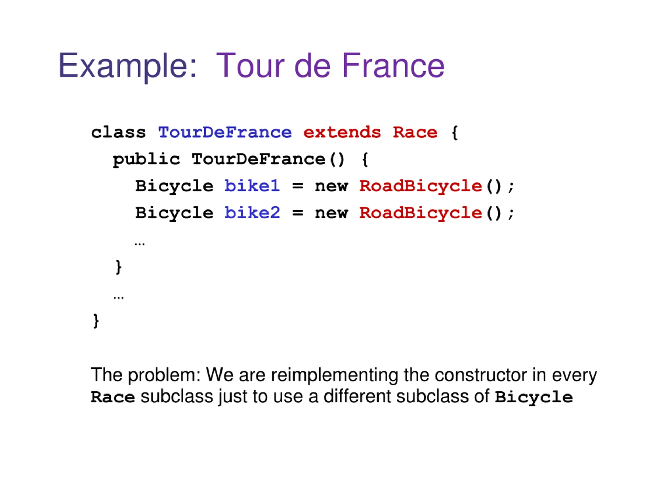 Example: Tour de France class TourDeFrance extends Race { public TourDeFrance() { Bicycle bike1 = new RoadBicycle(); Bicycle bike2 = new RoadBicycle(); } } The problem: We are reimplementing the constructor in every Race subclass just to use a different subclass of Bicycle