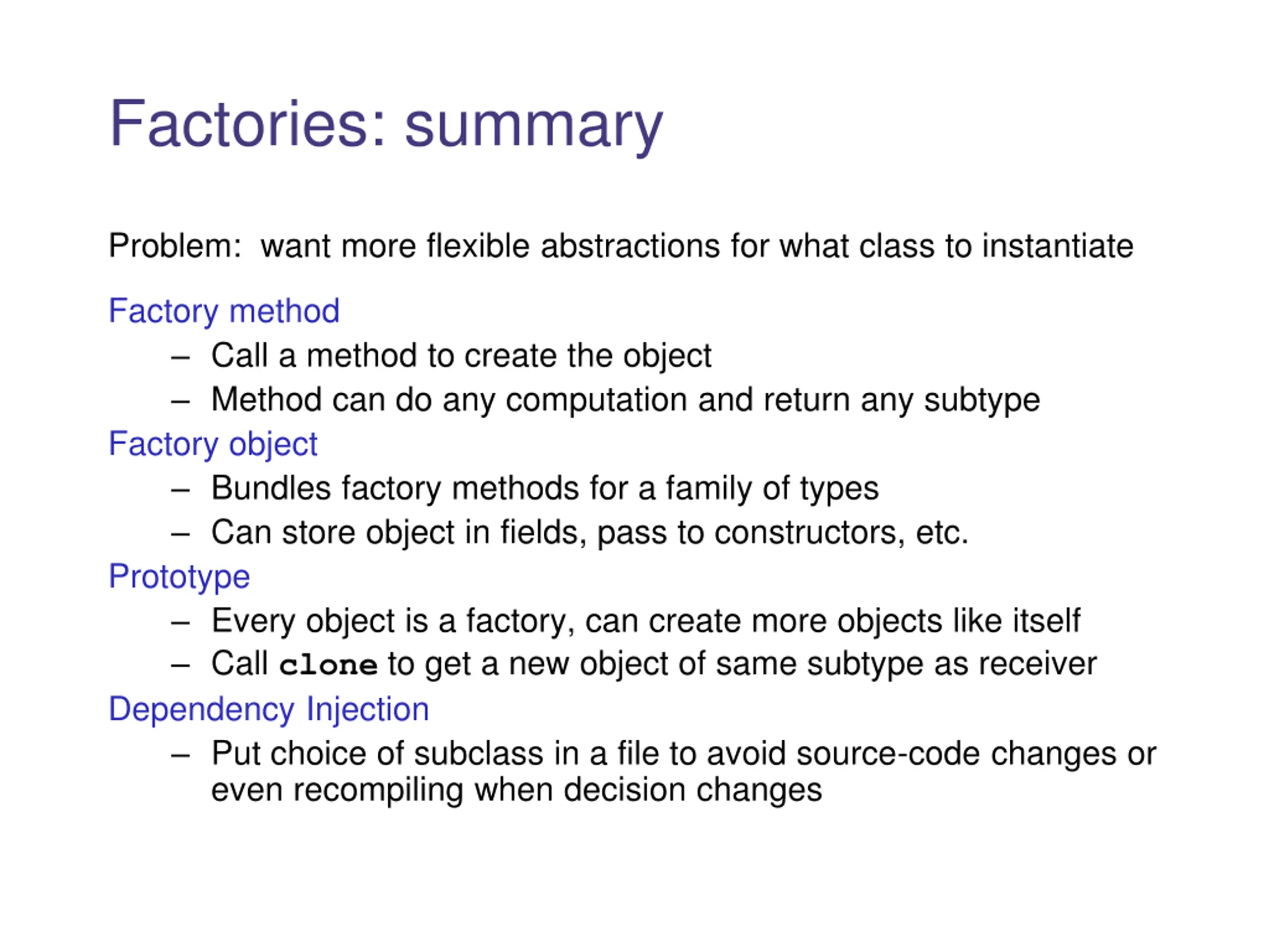 Factories: summary Problem: want more flexible abstractions for what class to instantiate Factory method Call a method to create the object Method can do any computation and return any subtype Factory object Bundles factory methods for a family of types Can store object in fields, pass to constructors, etc. Prototype Every object is a factory, can create more objects like itself Call clone to get a new object of same subtype as receiver Dependency Injection Put choice of subclass in a file to avoid source-code changes or even recompiling when decision changes
