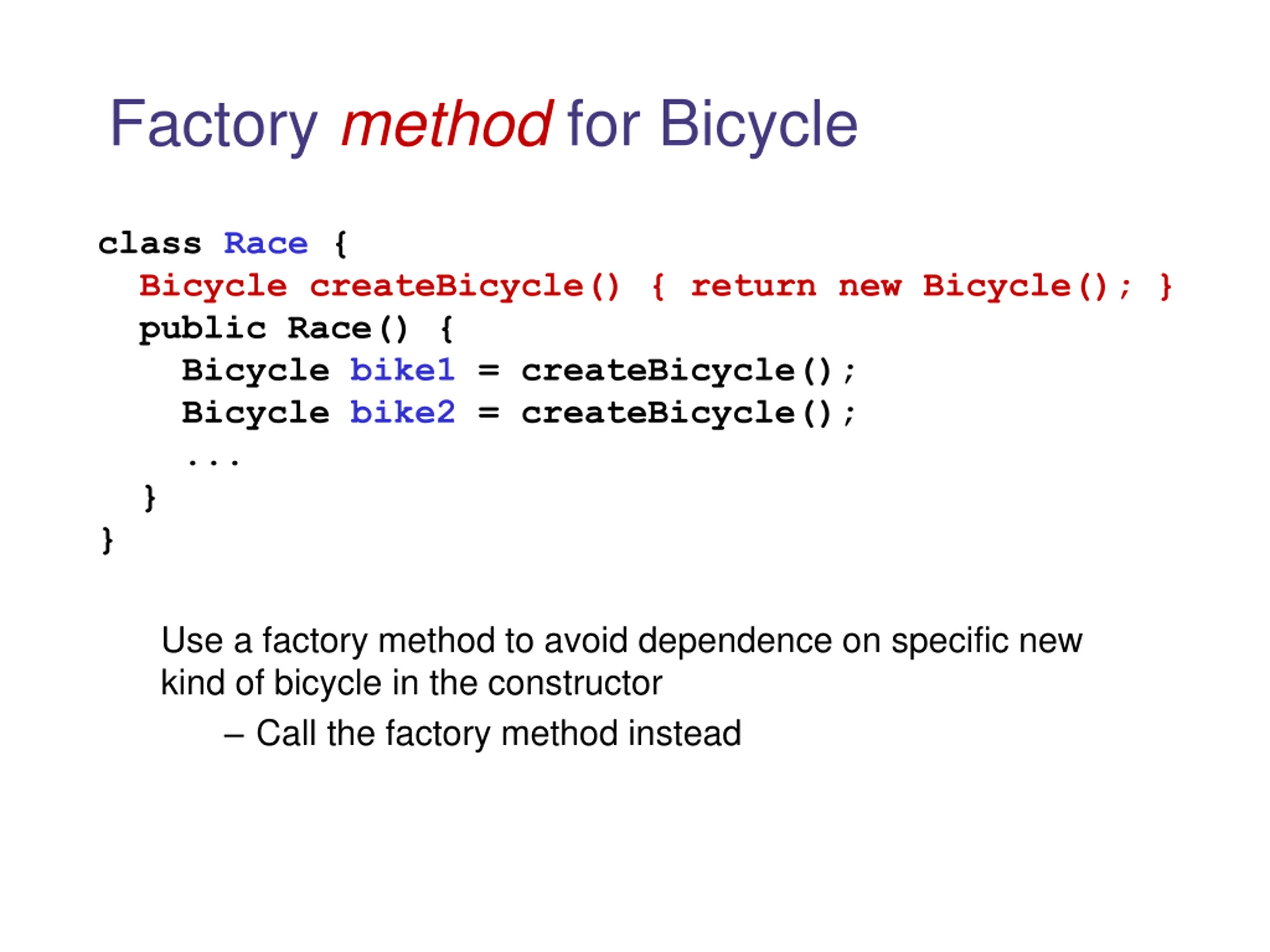 Factory method for Bicycle class Race { Bicycle createBicycle() { return new Bicycle(); } public Race() { Bicycle bike1 = createBicycle(); Bicycle bike2 = createBicycle(); ... } } Use a factory method to avoid dependence on specific new kind of bicycle in the constructor Call the factory method instead